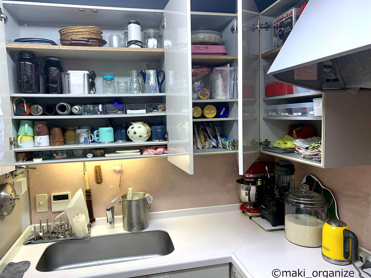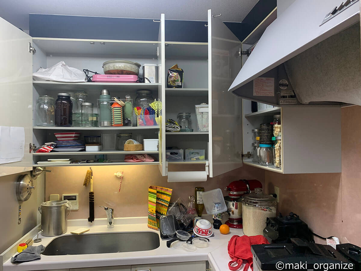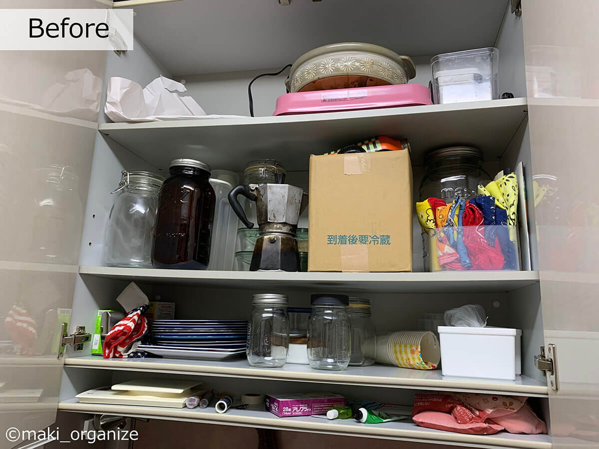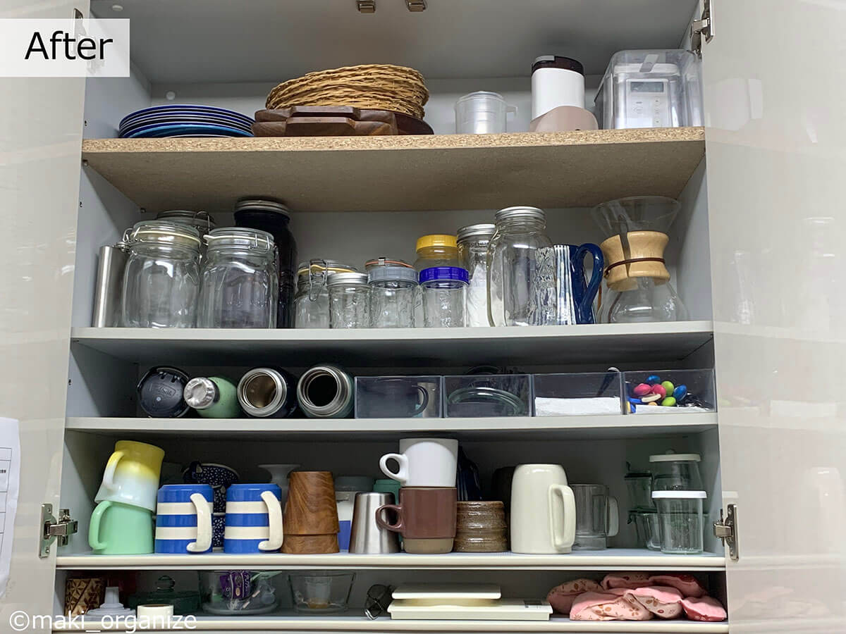 サイゾーウーマン暮らし住まい【キッチン収納】プロの「買わない」片付け術 暮らし [連載]女たちの「煩悩部屋」ビフォーアフター 【キッチン収納ビフォーアフター】プロの「買わない」片付け実例は? 2024/07/10 17:00 伊藤まき(収納ライター) 「汚部屋」ビフォーアフター 整理収納アドバイザーの伊藤まきさんが、片付けに悩む読者の自宅を使いやすく生まれ変わらせる連載シリーズ【「煩悩部屋」ビフォーアフター】。 連載企画『ビフォーアフター』新シーズンです。第9回目の片付けモニターは、港区・3LDKのマンションで暮らす4人家族のGさん(40歳)。今回は、汚部屋の片付けではなく、収納グッズを買わないで「賃貸暮らし」のキッチンを使いやすく手直しする特別編です。 目次 ・【お悩み】収納家具やボックスを増やさないで片付けたい ・【コーナン】パーチクルボードで吊り戸棚に棚板を追加 ・【キッチン収納】①②③ビフォー ・【キッチン収納】①のビフォーアフター&ポイント ・【キッチン収納】②のビフォーアフター&ポイント ・【キッチン収納】③のビフォーアフター&ポイント ・【まとめ】棚板追加で収納力アップ&快適に! 【お悩み】収納家具やボックスを増やさないで片付けたい 戸棚が低い位置にある、アメリカ風マンション(C)maki_organize クライアントプロフィール ・Gさん(40歳) ・4人家族 ・3LDK ・賃貸マンション ・東京都港区在住 収納に関する要望 ・引越しが多いため、収納家具は増やさない ・かさばる「プラスチックボックス」を増やさない ・モノの量は減らさない(捨てない) 写真はGさん宅のキッチンです。外国人向けなので、全体の造りが一般的なマンションよりも大きめ。「海外転勤が多い」とのことなので、上記以下のこだわりを守りながら、収納を手直しすることにしました。 【コーナン】「パーチクルボード1,628円」で吊り戸棚に棚板を追加 木くずのような細かい木材を接着剤で固めた板材。耐水性が高い(C)maki_organize 収納家具を増やしたくないとのことだったので、大きな板材を戸棚のサイズに合わせてカットし、棚板を増やすことにしました。 転勤による引越しが多いお宅なので、今回は木材ではなく「安価で退去時に処分しやすい」パーチクルボードを選択しています。 引越しが多いからこそ、収納予算は抑えめに! コーナンアプリ使用で、カット代は無料(C)maki_organize パーチクルボード(182×60cm)を5枚にカットしました。1枚あたり約325円に抑えることができたので、非常にリーズナブルです。 今回は安価で処分しやすい板材を選びましたが、引越しの予定がない場合は「木材の化粧板」でも良いでしょう。90×30cmで約1,500円なので、今回と同じサイズなら予算は約6,000円以上となります。 【キッチン収納】①②③ビフォー (C)maki_organize 今回は①②③の吊り戸棚の収納を棚板を使って手直ししていきます。 次からは、ビフォーアフターとポイントをそれぞれご紹介します。 【①のビフォーアフター】コンロの近くは食材を置かない (Before)コンロに近い場所に食材が収納されている(C)maki_organize (After)ふきんなどのリネン類を収納(C)maki_organize 棚板を1枚増やすだけで、収納力が大幅にアップしました。最下段には食材を入れていましたが、コンロが近い場所なので、ふきんなどの収納場所に変更しています。 【①のポイント】「高さ10cm」の低い棚にキッチン小物を収納 (C)maki_organize 棚板を組み直すときは、高さ10cm前後の「低い棚」を用意すると◎です。今回は、セリア「キレイストッカー ワイド」にキッチン小物を収納しました。取手がついているので、引き出しのように使えて便利です。 【②のビフォーアフター】最上段に使用頻度の低いモノを収納 (Before)最上段が空の状態(C)maki_organize (After)使用頻度が低いモノを最上段に(C)maki_organize 最上段の高さに適したモノがわからず、空の状態になっていました。 棚板を追加することで、土鍋やキッチン家電のちょうど良い収納スペースに。手の届きにくい最上段には、使用頻度の低いモノを入れるのがおすすめです。 ほかの段も「食材ストック用」のスペースに変更しました。 【②のポイント】水筒や広口瓶を低い棚に収納 Gさんがコレクションした米国製の頑丈な広口瓶(最下段)(C)maki_organize こちらにも①と同様に、高さ10cm前後の「低い棚」を用意しました。水筒や広口瓶(ともに8cm)を横倒しにして収納できる空間に。左端にはセリア「キレイストッカー ワイド」をひとつだけ追加。ストッパーにもなるので、出し入れしやすく便利です。 【③のビフォーアフター】シンク上は「使用頻度」が高いモノを収納 (Before)ひと目で内容を把握するのがむずかしい(C)maki_organize (After)種類別にまとまっているのでわかりやすく、手も届きやすい(C)maki_organize 棚板を1枚追加することで、5分割のスペースに! シンク上の棚なので、カップ類を中心に「使用頻度」が高いモノを配置しました。 Gさん宅の吊り戸棚は、震災時ストッパーつきで造りが頑丈なので、「重た