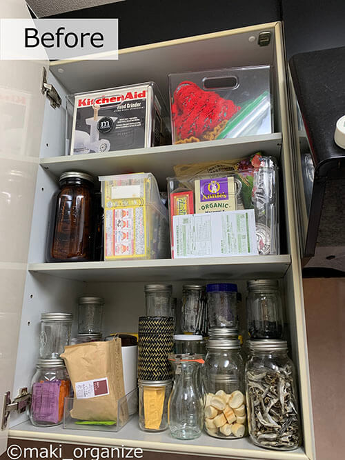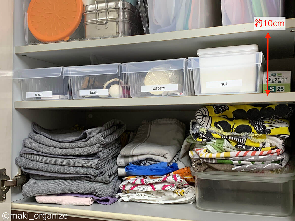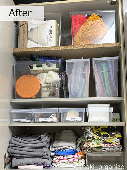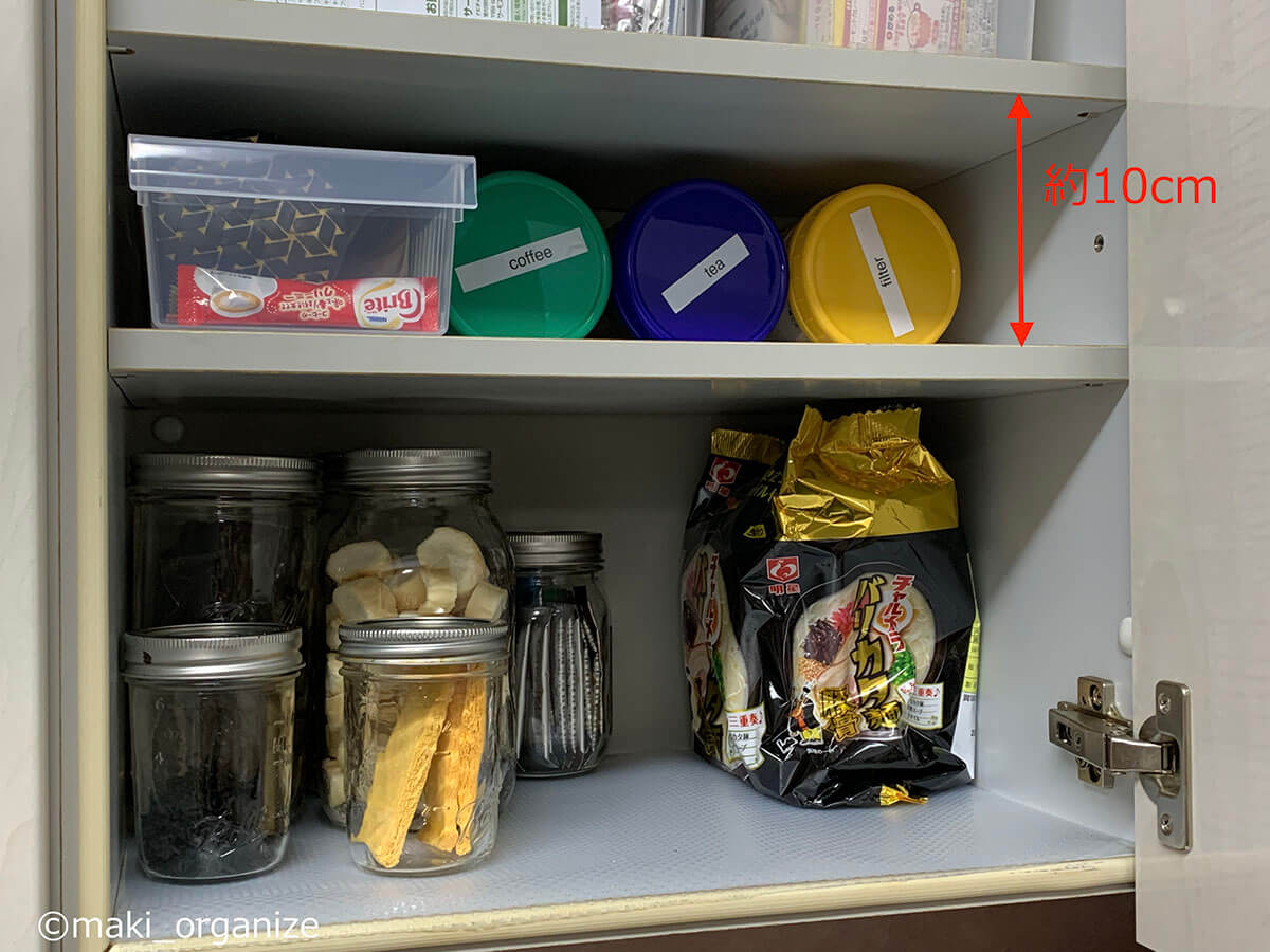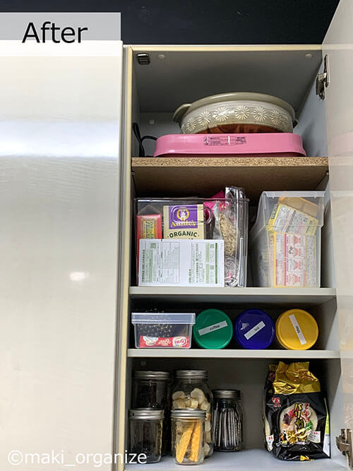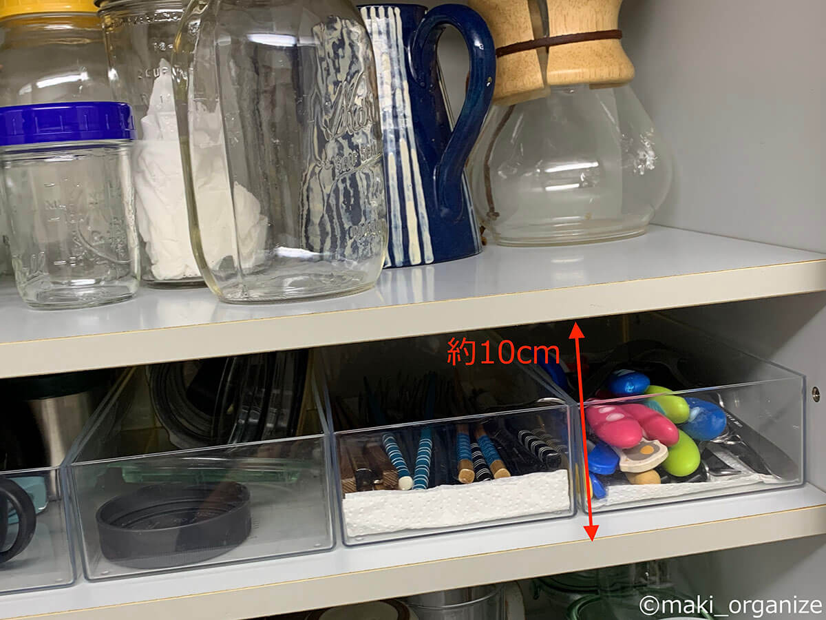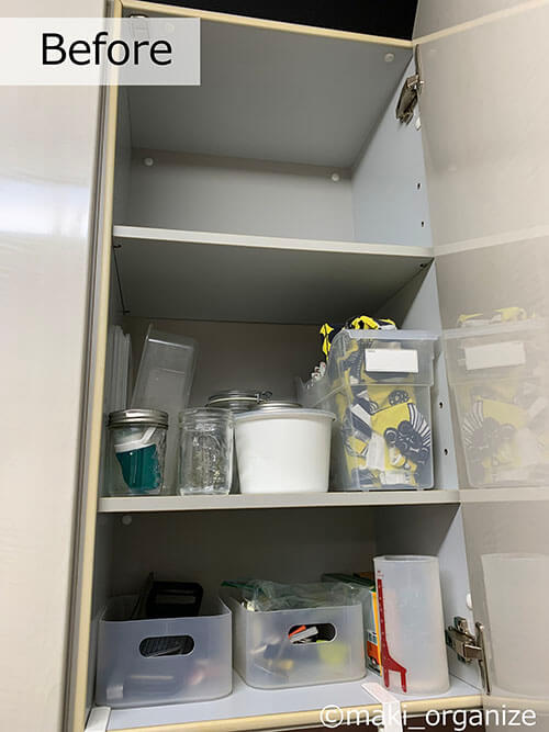 サイゾーウーマン暮らし住まい【キッチン収納】プロの「買わない」片付け術 暮らし [連載]女たちの「煩悩部屋」ビフォーアフター 【キッチン収納ビフォーアフター】プロの「買わない」片付け実例は? 2024/07/10 17:00 伊藤まき(収納ライター) 「汚部屋」ビフォーアフター 整理収納アドバイザーの伊藤まきさんが、片付けに悩む読者の自宅を使いやすく生まれ変わらせる連載シリーズ【「煩悩部屋」ビフォーアフター】。 連載企画『ビフォーアフター』新シーズンです。第9回目の片付けモニターは、港区・3LDKのマンションで暮らす4人家族のGさん(40歳)。今回は、汚部屋の片付けではなく、収納グッズを買わないで「賃貸暮らし」のキッチンを使いやすく手直しする特別編です。 目次 ・【お悩み】収納家具やボックスを増やさないで片付けたい ・【コーナン】パーチクルボードで吊り戸棚に棚板を追加 ・【キッチン収納】①②③ビフォー ・【キッチン収納】①のビフォーアフター&ポイント ・【キッチン収納】②のビフォーアフター&ポイント ・【キッチン収納】③のビフォーアフター&ポイント ・【まとめ】棚板追加で収納力アップ&快適に! 【お悩み】収納家具やボックスを増やさないで片付けたい 戸棚が低い位置にある、アメリカ風マンション(C)maki_organize クライアントプロフィール ・Gさん(40歳) ・4人家族 ・3LDK ・賃貸マンション ・東京都港区在住 収納に関する要望 ・引越しが多いため、収納家具は増やさない ・かさばる「プラスチックボックス」を増やさない ・モノの量は減らさない(捨てない) 写真はGさん宅のキッチンです。外国人向けなので、全体の造りが一般的なマンションよりも大きめ。「海外転勤が多い」とのことなので、上記以下のこだわりを守りながら、収納を手直しすることにしました。 【コーナン】「パーチクルボード1,628円」で吊り戸棚に棚板を追加 木くずのような細かい木材を接着剤で固めた板材。耐水性が高い(C)maki_organize 収納家具を増やしたくないとのことだったので、大きな板材を戸棚のサイズに合わせてカットし、棚板を増やすことにしました。 転勤による引越しが多いお宅なので、今回は木材ではなく「安価で退去時に処分しやすい」パーチクルボードを選択しています。 引越しが多いからこそ、収納予算は抑えめに! コーナンアプリ使用で、カット代は無料(C)maki_organize パーチクルボード(182×60cm)を5枚にカットしました。1枚あたり約325円に抑えることができたので、非常にリーズナブルです。 今回は安価で処分しやすい板材を選びましたが、引越しの予定がない場合は「木材の化粧板」でも良いでしょう。90×30cmで約1,500円なので、今回と同じサイズなら予算は約6,000円以上となります。 【キッチン収納】①②③ビフォー (C)maki_organize 今回は①②③の吊り戸棚の収納を棚板を使って手直ししていきます。 次からは、ビフォーアフターとポイントをそれぞれご紹介します。 【①のビフォーアフター】コンロの近くは食材を置かない (Before)コンロに近い場所に食材が収納されている(C)maki_organize (After)ふきんなどのリネン類を収納(C)maki_organize 棚板を1枚増やすだけで、収納力が大幅にアップしました。最下段には食材を入れていましたが、コンロが近い場所なので、ふきんなどの収納場所に変更しています。 【①のポイント】「高さ10cm」の低い棚にキッチン小物を収納 (C)maki_organize 棚板を組み直すときは、高さ10cm前後の「低い棚」を用意すると◎です。今回は、セリア「キレイストッカー ワイド」にキッチン小物を収納しました。取手がついているので、引き出しのように使えて便利です。 【②のビフォーアフター】最上段に使用頻度の低いモノを収納 (Before)最上段が空の状態(C)maki_organize (After)使用頻度が低いモノを最上段に(C)maki_organize 最上段の高さに適したモノがわからず、空の状態になっていました。 棚板を追加することで、土鍋やキッチン家電のちょうど良い収納スペースに。手の届きにくい最上段には、使用頻度の低いモノを入れるのがおすすめです。 ほかの段も「食材ストック用」のスペースに変更しました。 【②のポイント】水筒や広口瓶を低い棚に収納 Gさんがコレクションした米国製の頑丈な広口瓶(最下段)(C)maki_organize こちらにも①と同様に、高さ10cm前後の「低い棚」を用意しました。水筒や広口瓶(ともに8cm)を横倒しにして収納できる空間に。左端にはセリア「キレイストッカー ワイド」をひとつだけ追加。ストッパーにもなるので、出し入れしやすく便利です。 【③のビフォーアフター】シンク上は「使用頻度」が高いモノを収納 (Before)ひと目で内容を把握するのがむずかしい(C)maki_organize (After)種類別にまとまっているのでわかりやすく、手も届きやすい(C)maki_organize 棚板を1枚追加することで、5分割のスペースに! シンク上の棚なので、カップ類を中心に「使用頻度」が高いモノを配置しました。 Gさん宅の吊り戸棚は、震災時ストッパーつきで造りが頑丈なので、「重た