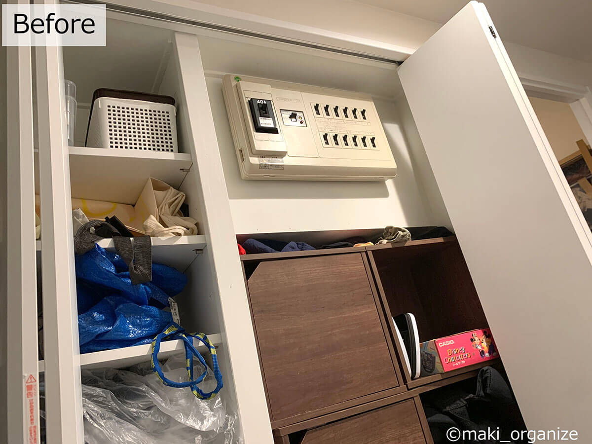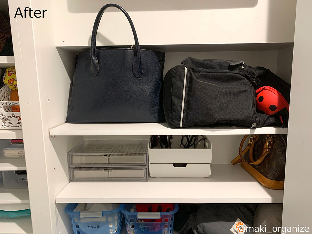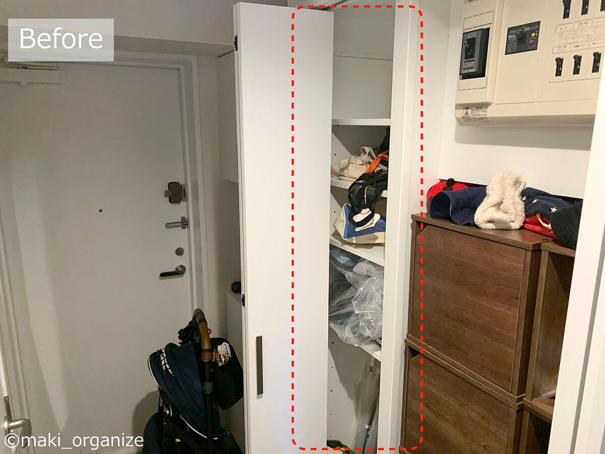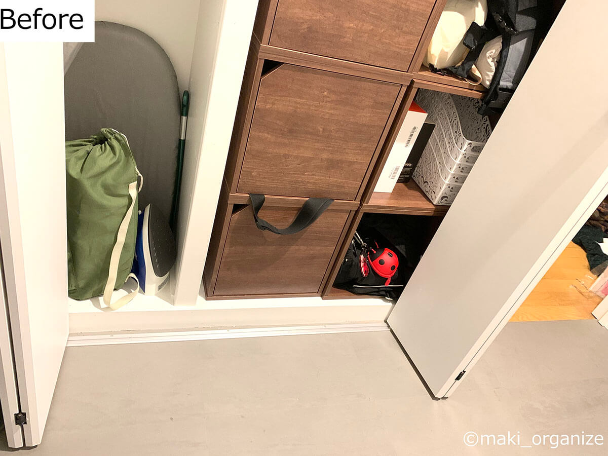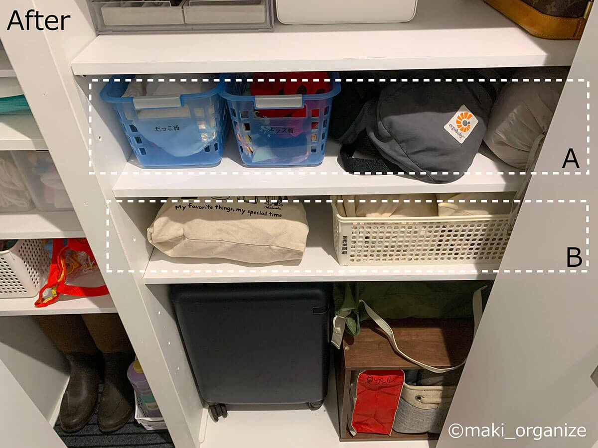 サイゾーウーマン暮らし住まいサッと身支度できる「プロの片付け術」 暮らし [連載]女たちの「煩悩部屋」ビフォーアフター 下駄箱横の収納、「棚板」を増やすのが正解! 「サッと身支度できる」プロの片付け術は? 2024/10/02 17:00 伊藤まき(収納ライター) 「汚部屋」ビフォーアフター 整理収納アドバイザーの伊藤まきさんが、片付けに悩む読者の自宅を使いやすく生まれ変わらせる連載シリーズ【「煩悩部屋」ビフォーアフター】。 連載企画『ビフォーアフター』新シーズンです。第10回目の片付けモニターは、東京都世田谷区・1SLDKで暮らす3人家族のまいさん(32歳)。今回は、汚部屋の片付けではなく「リノベマンション」の収納を手直しする特別編です。 目次 ・【お悩み1】下駄箱サイドの収納庫の使い方がわからない ・【お悩み1】アフター&ポイント ・【お悩み2】中途半端な空間に何を入れたら良いかわからない ・【お悩み2】アフター&ポイント ・【動画】全体ビフォーアフター 【お悩み1】下駄箱サイドの収納庫の使い方がわからない 扉付き1段のカラーボックスが使いにくそう(C)maki_organize クライアントプロフィール ・まいさん(32歳) ・保育園の園長先生(フルワーク) ・育児系インフルエンサー“まい先生“としても活躍 ・3人家族 ・1SLDK ・中古マンションをリノベーション購入(持ち家) ・東京都世田谷区在住 収納に関する要望 ・掃除や片付けの頻度を少なくしたい ・子どもが自分で身支度できる仕組みを作りたい ・ベッドルームのレイアウトを変えたい ・シンプルに暮らしたいので、家具を増やしたくない 前回までのクローゼットに続き、今回は下駄箱の横にある収納庫を見直していきます。現状は写真のような状態。せっかくの広い空間を生かし切れていません。 (Before)扉付きなので、出し入れも二度手間に(C)maki_organize 下駄箱のサイドにある収納庫なので、本来なら「身支度グッズ」が揃っているのが理想ですが、まったく関係がない空き箱なども……。 カラーボックスは扉付きで使いにくく、板の厚みの分、収納力も減ってしまいます。玄関で必要なモノも揃っていなかったため、「外出時の身支度」が簡単になる収納法を紹介していきます。 【最初にやるべきこと】カラーボックスを撤去、「棚板」を増やす! 棚板のサイズは約W76×D32cm(C)maki_organize 最初にやるべきことは収納スペースに「棚板を増やす」こと。収納庫内に設置されていた扉付き1段のカラーボックスを撤去し、コーナン※で4枚分を用意しました。 最上段と下段を除いて、高さ約18cmの間隔が小物収納にベストサイズ。サイドにダボ穴が無い場合は、棚柱や棚受けを設置しましょう。賃貸の場合は、スチールラックや本棚を活用すると良いですね。 ※アプリ会員になると、木材カット代が10枚まで無料になるサービスあり。他のホームセンターだと、1カット50円〜が相場です。 【右上 After】出勤バッグや帽子など「身支度グッズ」の定位置に (After)スッキリして収納力もUP!(C)maki_organize 最上段は、夫婦の通勤バッグを。2段目は、週末用のバッグやアクセサリー類を置きました。いちばん取り出しやすい場所なので、毎日「外に持ち出すモノ」「身につけるモノ」の定位置として活用します。 【右上 ポイント】毎日使う「アクセサリー」を置くと便利 出しやすく、戻しやすいケースを選ぶと◎(C)maki_organize メガネやアクセサリーは本来クローゼットまわりに収納するのが望ましいのですが、適当な家具がないためこの場所に。 扉を開けて、ワンアクションで取り出せる箱やトレーを選ぶのがおすすめです。今回は家にもともとあった、韓国ブランド「リテム・シスマックス」のケースを使いました。ニトリにも類似品があります。 【右下 Before】折り扉とぶつかって出し入れできない!? (Before)もったいない空間が多かった(C)maki_organize 扉付き1段のカラーボックスが、8個設置されていました。以前の家ではシンデレラフィットだったそうですが、今の家は折り扉なので、奥のモノが取り出しにくくなって不便です。 【右下 After】「よく使うモノ」をボックスにまとめて収納 (After)取り出しやすい位置に毎日使うモノを(C)maki_organize 3段目(A)は、育児グッズを。小物は、ボックスにまとめることで取り出しやすくなります。4段目(B)には、自転車グッズを収納しました。 【右下 ポイント】最下段は「災害グッズ」と重いモノを! (After)スーツケースの中に災害グッズを入れています(C)maki_organize 玄関近くの収納庫に「何を入れるべきか」迷ったら、「外に持ち出すモノ」を中心に考えると良いでしょう。最下段には、災害グッズを詰めたスーツケースを。高さの違いを補うために、カラーボックス1段を残しました。 【お悩み2】中途半端な空間に何を入れたら良いかわからない 棚板のサイズは、約W35×D32cm(C)maki_organize 次は、赤線で囲った縦の空間です。既存の棚板が4枚あり、最下段は「傘入れ」になっていました。 折り扉があるので、空間の1/3を塞いでしまう状態。