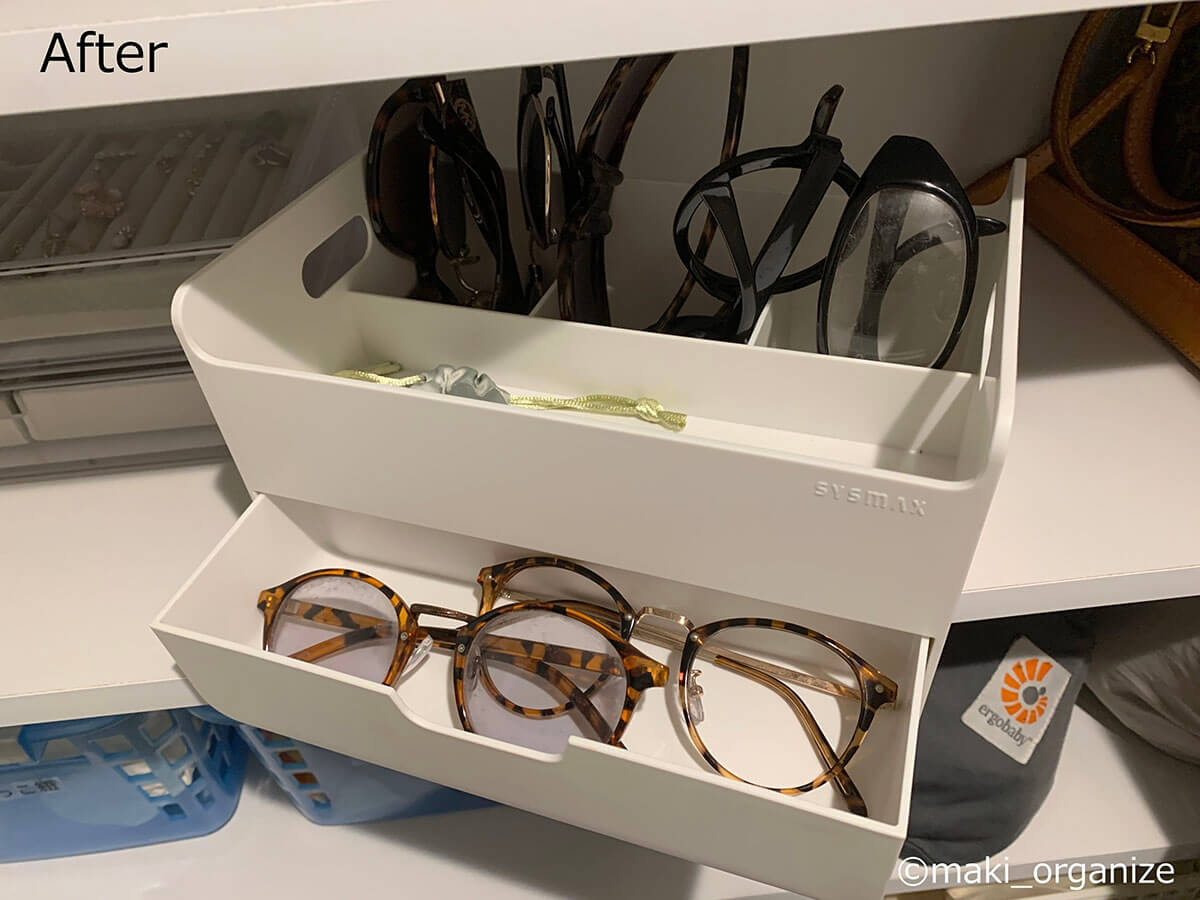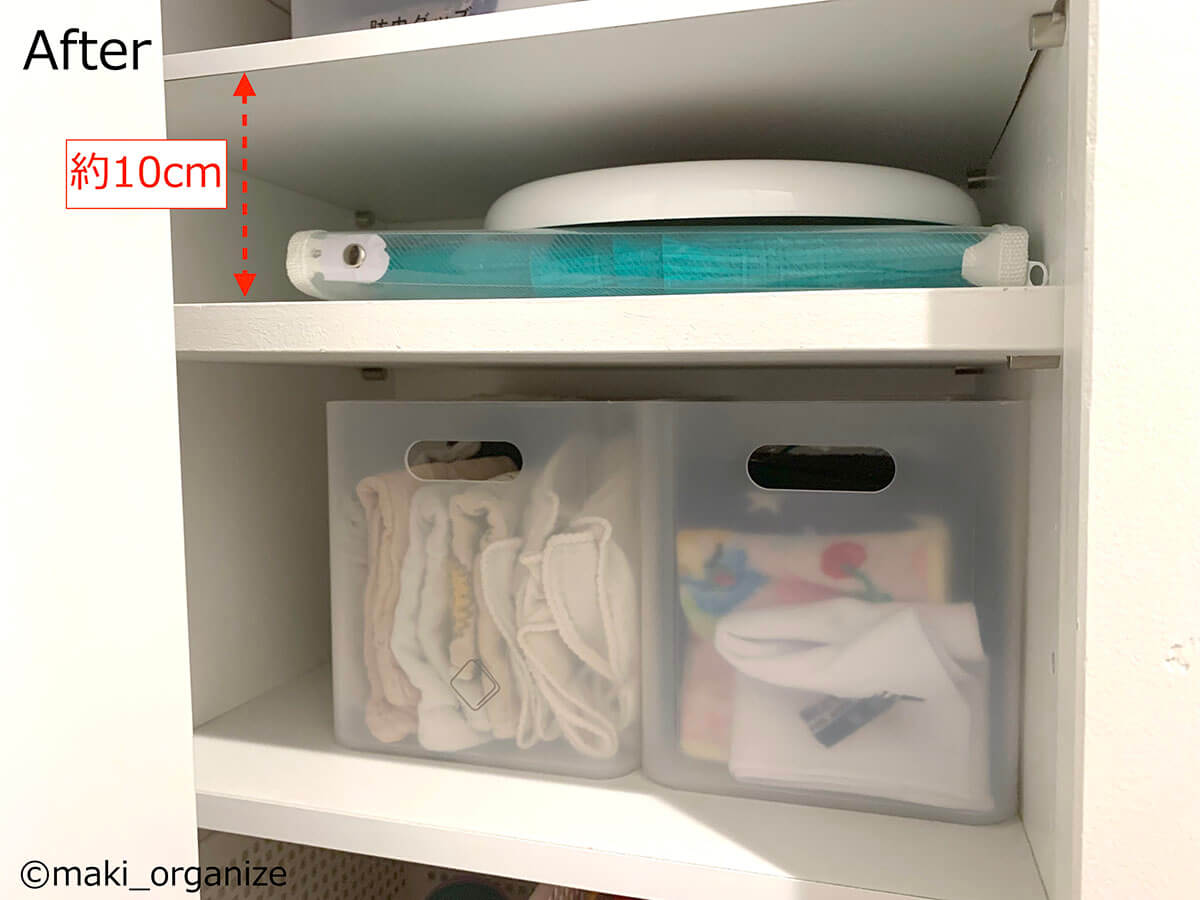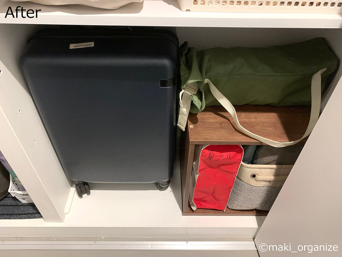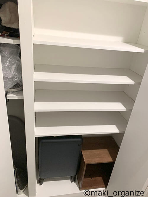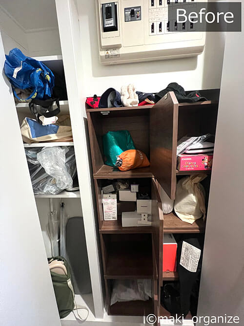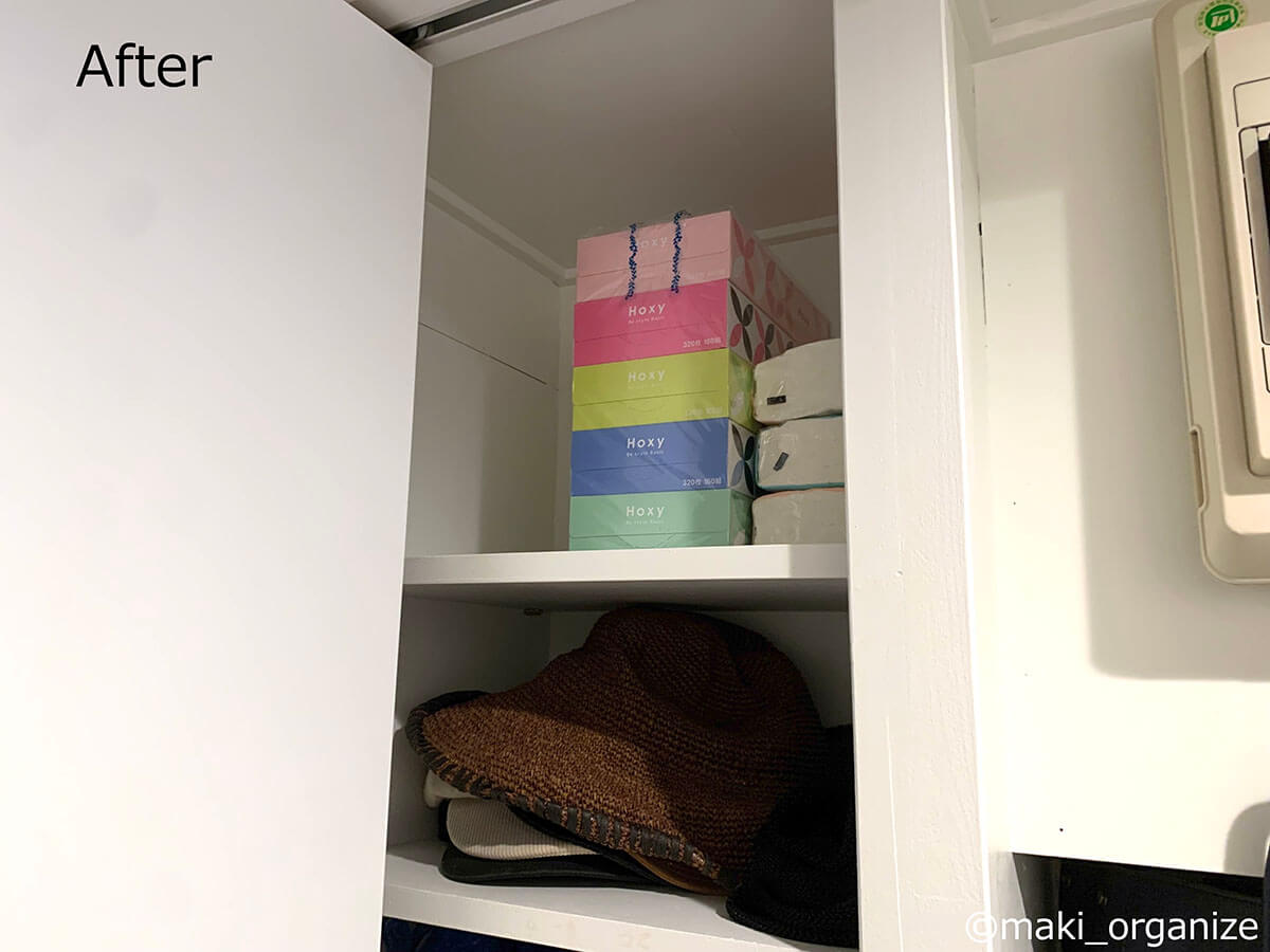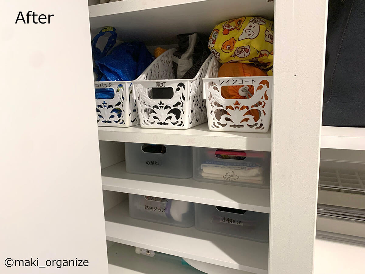 サイゾーウーマン暮らし住まいサッと身支度できる「プロの片付け術」 暮らし [連載]女たちの「煩悩部屋」ビフォーアフター 下駄箱横の収納、「棚板」を増やすのが正解! 「サッと身支度できる」プロの片付け術は? 2024/10/02 17:00 伊藤まき(収納ライター) 「汚部屋」ビフォーアフター 整理収納アドバイザーの伊藤まきさんが、片付けに悩む読者の自宅を使いやすく生まれ変わらせる連載シリーズ【「煩悩部屋」ビフォーアフター】。 連載企画『ビフォーアフター』新シーズンです。第10回目の片付けモニターは、東京都世田谷区・1SLDKで暮らす3人家族のまいさん(32歳)。今回は、汚部屋の片付けではなく「リノベマンション」の収納を手直しする特別編です。 目次 ・【お悩み1】下駄箱サイドの収納庫の使い方がわからない ・【お悩み1】アフター&ポイント ・【お悩み2】中途半端な空間に何を入れたら良いかわからない ・【お悩み2】アフター&ポイント ・【動画】全体ビフォーアフター 【お悩み1】下駄箱サイドの収納庫の使い方がわからない 扉付き1段のカラーボックスが使いにくそう(C)maki_organize クライアントプロフィール ・まいさん(32歳) ・保育園の園長先生(フルワーク) ・育児系インフルエンサー“まい先生“としても活躍 ・3人家族 ・1SLDK ・中古マンションをリノベーション購入(持ち家) ・東京都世田谷区在住 収納に関する要望 ・掃除や片付けの頻度を少なくしたい ・子どもが自分で身支度できる仕組みを作りたい ・ベッドルームのレイアウトを変えたい ・シンプルに暮らしたいので、家具を増やしたくない 前回までのクローゼットに続き、今回は下駄箱の横にある収納庫を見直していきます。現状は写真のような状態。せっかくの広い空間を生かし切れていません。 (Before)扉付きなので、出し入れも二度手間に(C)maki_organize 下駄箱のサイドにある収納庫なので、本来なら「身支度グッズ」が揃っているのが理想ですが、まったく関係がない空き箱なども……。 カラーボックスは扉付きで使いにくく、板の厚みの分、収納力も減ってしまいます。玄関で必要なモノも揃っていなかったため、「外出時の身支度」が簡単になる収納法を紹介していきます。 【最初にやるべきこと】カラーボックスを撤去、「棚板」を増やす! 棚板のサイズは約W76×D32cm(C)maki_organize 最初にやるべきことは収納スペースに「棚板を増やす」こと。収納庫内に設置されていた扉付き1段のカラーボックスを撤去し、コーナン※で4枚分を用意しました。 最上段と下段を除いて、高さ約18cmの間隔が小物収納にベストサイズ。サイドにダボ穴が無い場合は、棚柱や棚受けを設置しましょう。賃貸の場合は、スチールラックや本棚を活用すると良いですね。 ※アプリ会員になると、木材カット代が10枚まで無料になるサービスあり。他のホームセンターだと、1カット50円〜が相場です。 【右上 After】出勤バッグや帽子など「身支度グッズ」の定位置に (After)スッキリして収納力もUP!(C)maki_organize 最上段は、夫婦の通勤バッグを。2段目は、週末用のバッグやアクセサリー類を置きました。いちばん取り出しやすい場所なので、毎日「外に持ち出すモノ」「身につけるモノ」の定位置として活用します。 【右上 ポイント】毎日使う「アクセサリー」を置くと便利 出しやすく、戻しやすいケースを選ぶと◎(C)maki_organize メガネやアクセサリーは本来クローゼットまわりに収納するのが望ましいのですが、適当な家具がないためこの場所に。 扉を開けて、ワンアクションで取り出せる箱やトレーを選ぶのがおすすめです。今回は家にもともとあった、韓国ブランド「リテム・シスマックス」のケースを使いました。ニトリにも類似品があります。 【右下 Before】折り扉とぶつかって出し入れできない!? (Before)もったいない空間が多かった(C)maki_organize 扉付き1段のカラーボックスが、8個設置されていました。以前の家ではシンデレラフィットだったそうですが、今の家は折り扉なので、奥のモノが取り出しにくくなって不便です。 【右下 After】「よく使うモノ」をボックスにまとめて収納 (After)取り出しやすい位置に毎日使うモノを(C)maki_organize 3段目(A)は、育児グッズを。小物は、ボックスにまとめることで取り出しやすくなります。4段目(B)には、自転車グッズを収納しました。 【右下 ポイント】最下段は「災害グッズ」と重いモノを! (After)スーツケースの中に災害グッズを入れています(C)maki_organize 玄関近くの収納庫に「何を入れるべきか」迷ったら、「外に持ち出すモノ」を中心に考えると良いでしょう。最下段には、災害グッズを詰めたスーツケースを。高さの違いを補うために、カラーボックス1段を残しました。 【お悩み2】中途半端な空間に何を入れたら良いかわからない 棚板のサイズは、約W35×D32cm(C)maki_organize 次は、赤線で囲った縦の空間です。既存の棚板が4枚あり、最下段は「傘入れ」になっていました。 折り扉があるので、空間の1/3を塞いでしまう状態。