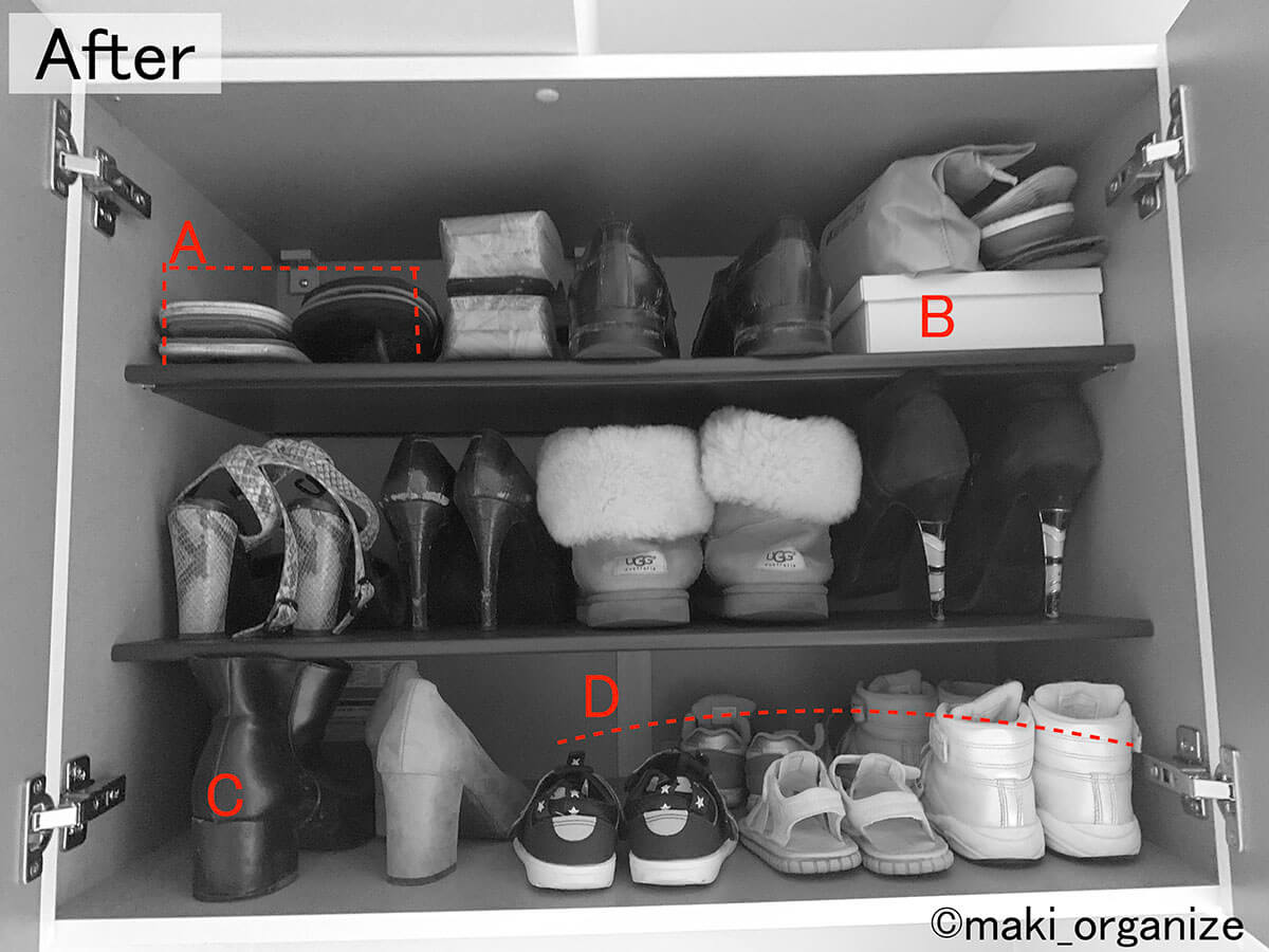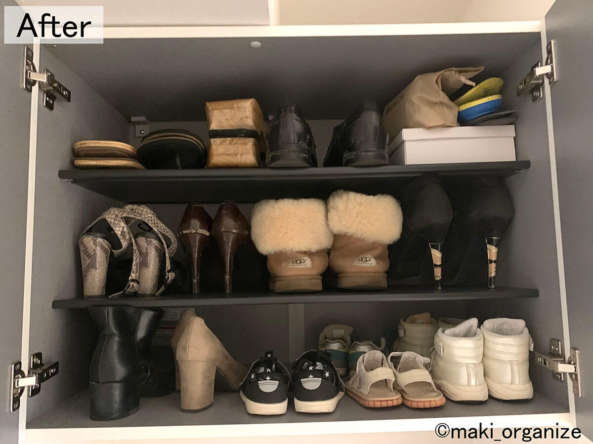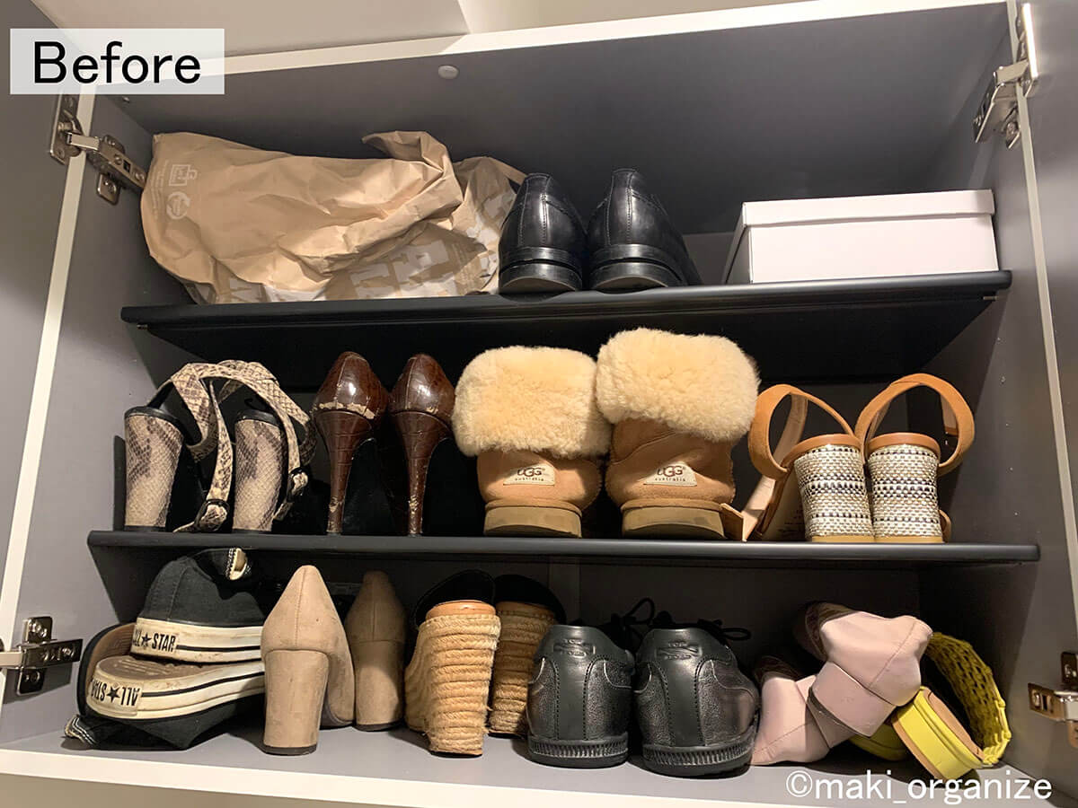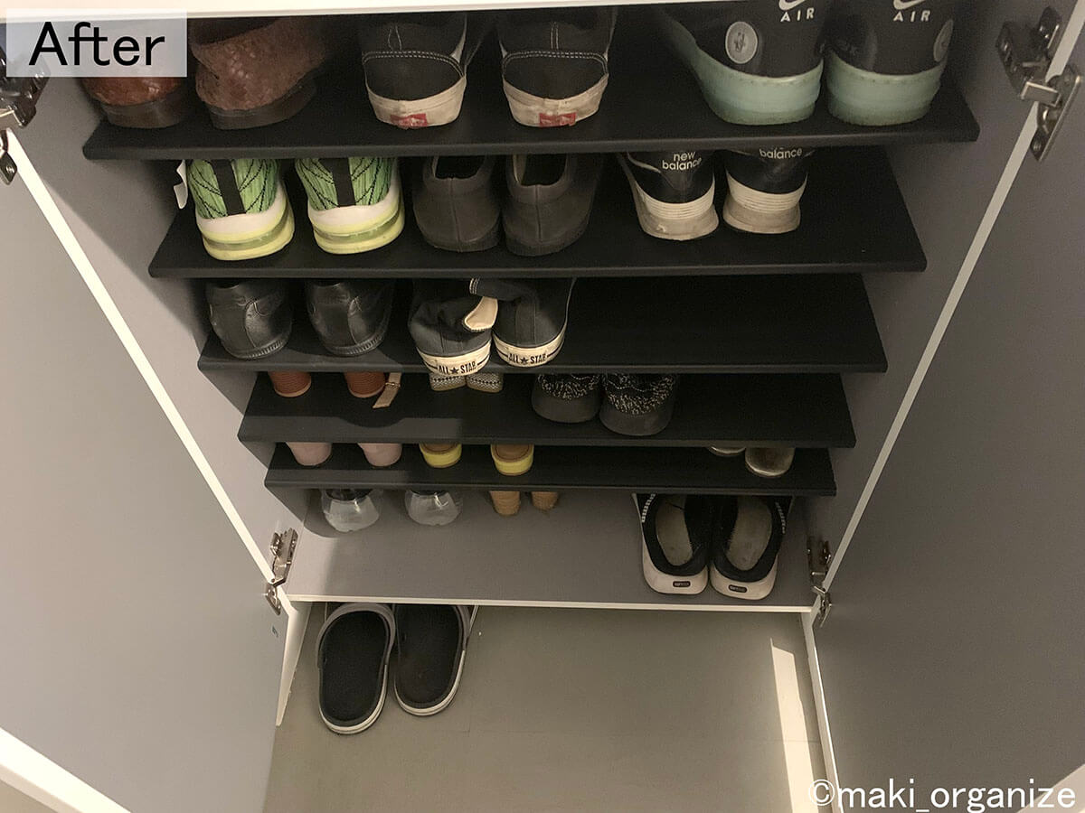 サイゾーウーマン暮らし住まい「小さな下駄箱・玄関」収納アイデア 暮らし [連載]女たちの「煩悩部屋」ビフォーアフター ブーツや傘もスッキリ! 片付けのプロが教える「小さめの下駄箱・玄関」収納アイデア3 2024/10/09 17:00 伊藤まき(収納ライター) 「汚部屋」ビフォーアフター 整理収納アドバイザーの伊藤まきさんが、片付けに悩む読者の自宅を使いやすく生まれ変わらせる連載シリーズ【「煩悩部屋」ビフォーアフター】。 連載企画『ビフォーアフター』新シーズンです。第10回目の片付けモニターは、東京都世田谷区・1SLDKで暮らす3人家族のまいさん(32歳)。今回は、汚部屋の片付けではなく「リノベマンション」の収納を手直しする特別編です。 目次 ・【お悩み】「小さめの下駄箱・玄関」の収納法がわからない ・【下駄箱下段】ビフォーアフター ・【下駄箱上段】ビフォーアフター ・【傘置き場】ビフォーアフター ・【まとめ】「棚板を増やす」のが一番! 【お悩み】「小さめの下駄箱・玄関」の収納法がわからない 都心のマンションなどに多い「小さめの下駄箱」(C)maki_organize クライアントプロフィール ・まいさん(32歳) ・保育園の園長先生(フルワーク) ・育児系インフルエンサー“まい先生“としても活躍 ・3人家族 ・1SLDK ・中古マンションをリノベーション購入(持ち家) ・東京都世田谷区在住 収納に関する要望 ・掃除や片付けの頻度を少なくしたい ・子どもが自分で身支度できる仕組みを作りたい ・ベッドルームのレイアウトを変えたい ・シンプルに暮らしたいので、家具を増やしたくない 今回はマンションなどに多い「小さめの下駄箱・玄関」の片付けアイデアをご紹介します。ポイントを押さえれば、ブーツや傘などの「長いモノ」や成長が早い「子ども靴」などをスッキリ収納することができます。 【最初にやるべきこと】玄関のベビーカーを移動、下駄箱の棚板を増やす ベビーカーを置くと、より狭くなります(C)maki_organize 最初にやるべきことは、下駄箱の「棚板を増やす」ことです。前回片付けた収納庫の場合はコーナンで棚板を用意しましたが、今回は「下駄箱の説明書」に記載された品番の棚板を取り寄せることにしました。 【下駄箱下段 Before】靴の「高さ」が合わず、ゴチャゴチャに! (Before)標準付属の板は、2枚だけ(C)maki_organize 下駄箱に標準付属していた棚板は2枚。重ねて設置していたので、計2段のスペースに靴を収納していました。使用頻度が低いブーツを入れていることが原因で、収納スペースが無駄になっている状態です。 【下駄箱下段 After】板を増やして、よく履く靴を優先に! (After)空間が2段から6段に増えました(C)maki_organize 使用頻度の低いブーツは別の場所へ移動。棚板を3枚増やし、計6段のスペースを作りました。よく履く靴を中心に、上段から同じ高さ・種類で収納していきます。靴の高さと種類を揃えることで、慌ただしく靴を出しても乱れにくい状態に。ゴチャゴチャしない下駄箱がキープできます。 【長い靴の収納法1】「ロングブーツ」は別の場所に移動 (After)前回紹介した、下駄箱サイドの収納庫(C)maki_organize 秋冬用のブーツは「衣替え用の靴」として、下駄箱横の収納庫に保管。雨の日に履く長靴は、よく履く(ことになる)靴に分類されるので、隣のクローゼットに移動しました。 【長い靴の収納法2】最上段に横置きもあり 汚れが気になる場合、不織布カバーをかけて(C)maki_organize 下駄箱の中に長い靴を置きたい場合は、最上段の棚に「横向き」で置いても良いでしょう。写真のようにヒールの向きを変えるとスリムに収納することができます。 【長い靴の収納法3】 「ブーツ収納グッズ」はNG収納? グッズを使うと、面倒で続かない収納になりがち(C)maki_organize ブーツ収納には、写真のようなクリップや専用ホルダーを使う方法もあります。とはいえ、出し入れのアクション数が増えるので「続けられるか?」は本人次第。 下駄箱の広さとブーツの数によっては、効果的な場合もあるので、100均グッズなどを活用して、継続できるか試してみても良いでしょう。 【下駄箱上段 Before→After】小さな「子どもの靴」は、埋もれない上段へ! (Before)男性用と女性用の靴が、ごちゃ混ぜに!(C)maki_organize (After)3段目は「子ども用の靴コーナー」に!(C)maki_organize 最上段には使用頻度の低い靴、2段目は女性靴、3段目は子ども靴を収納しました。3段目の最下段は手が届きやすく、しゃがまないで出し入れができるゴールデンスペース。可視性も良いため、小さくて埋もれやすい子ども靴の収納に適しています。 下駄箱上段の収納ポイント 季節の靴は「衣替え」として、移動するのもあり(C)maki_organize (A)のサンダルなど、高さのない靴を入れたスペースはコの字ラックを使えば収納力が2倍に。(B)のように使用頻度の低い靴を入れた箱を置き、2段にしてもOKです。 (C)は靴が埋もれてしまわないよう、斜めに配置しています。(D)の子ども靴は、「手前と奥」に分けて収納すると、空間を有効活