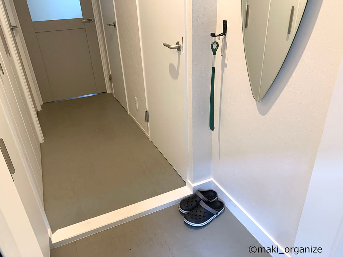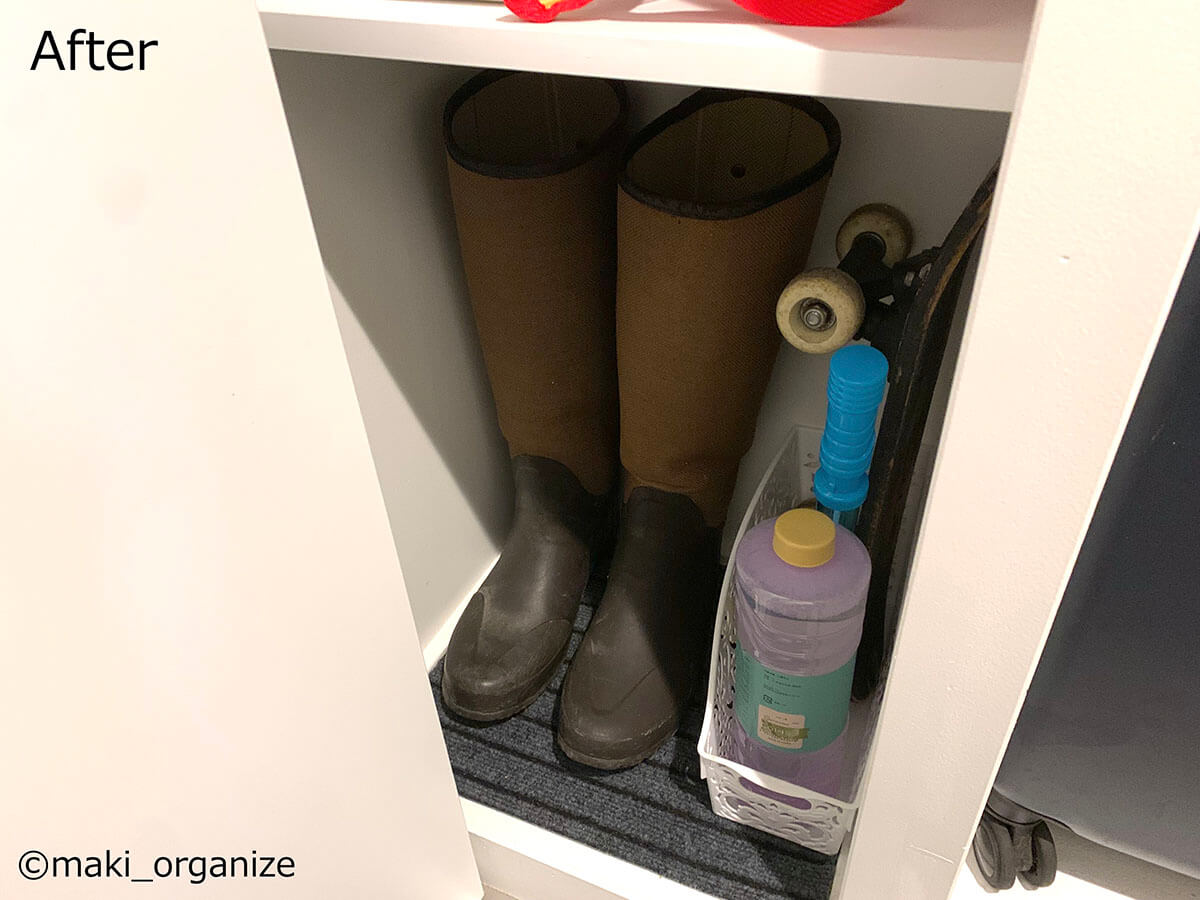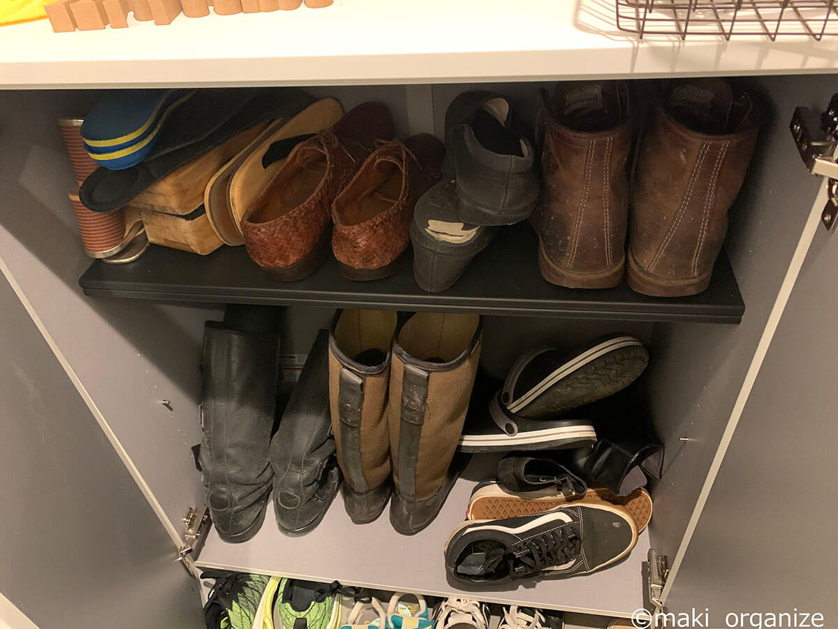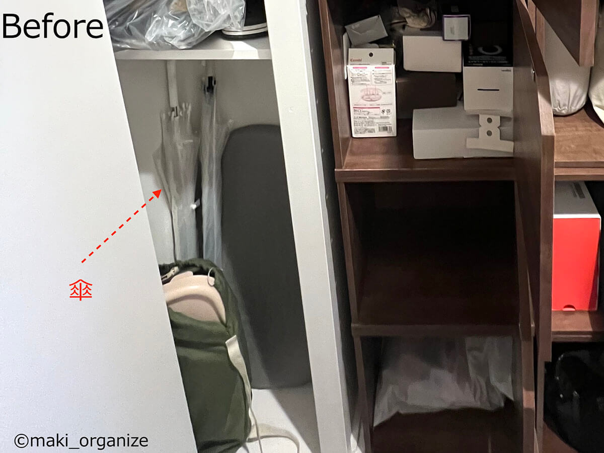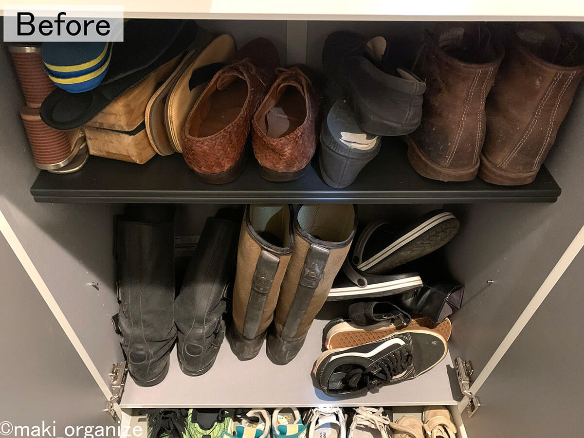 サイゾーウーマン暮らし住まい「小さな下駄箱・玄関」収納アイデア 暮らし [連載]女たちの「煩悩部屋」ビフォーアフター ブーツや傘もスッキリ! 片付けのプロが教える「小さめの下駄箱・玄関」収納アイデア3 2024/10/09 17:00 伊藤まき(収納ライター) 「汚部屋」ビフォーアフター 整理収納アドバイザーの伊藤まきさんが、片付けに悩む読者の自宅を使いやすく生まれ変わらせる連載シリーズ【「煩悩部屋」ビフォーアフター】。 連載企画『ビフォーアフター』新シーズンです。第10回目の片付けモニターは、東京都世田谷区・1SLDKで暮らす3人家族のまいさん(32歳)。今回は、汚部屋の片付けではなく「リノベマンション」の収納を手直しする特別編です。 目次 ・【お悩み】「小さめの下駄箱・玄関」の収納法がわからない ・【下駄箱下段】ビフォーアフター ・【下駄箱上段】ビフォーアフター ・【傘置き場】ビフォーアフター ・【まとめ】「棚板を増やす」のが一番! 【お悩み】「小さめの下駄箱・玄関」の収納法がわからない 都心のマンションなどに多い「小さめの下駄箱」(C)maki_organize クライアントプロフィール ・まいさん(32歳) ・保育園の園長先生(フルワーク) ・育児系インフルエンサー“まい先生“としても活躍 ・3人家族 ・1SLDK ・中古マンションをリノベーション購入(持ち家) ・東京都世田谷区在住 収納に関する要望 ・掃除や片付けの頻度を少なくしたい ・子どもが自分で身支度できる仕組みを作りたい ・ベッドルームのレイアウトを変えたい ・シンプルに暮らしたいので、家具を増やしたくない 今回はマンションなどに多い「小さめの下駄箱・玄関」の片付けアイデアをご紹介します。ポイントを押さえれば、ブーツや傘などの「長いモノ」や成長が早い「子ども靴」などをスッキリ収納することができます。 【最初にやるべきこと】玄関のベビーカーを移動、下駄箱の棚板を増やす ベビーカーを置くと、より狭くなります(C)maki_organize 最初にやるべきことは、下駄箱の「棚板を増やす」ことです。前回片付けた収納庫の場合はコーナンで棚板を用意しましたが、今回は「下駄箱の説明書」に記載された品番の棚板を取り寄せることにしました。 【下駄箱下段 Before】靴の「高さ」が合わず、ゴチャゴチャに! (Before)標準付属の板は、2枚だけ(C)maki_organize 下駄箱に標準付属していた棚板は2枚。重ねて設置していたので、計2段のスペースに靴を収納していました。使用頻度が低いブーツを入れていることが原因で、収納スペースが無駄になっている状態です。 【下駄箱下段 After】板を増やして、よく履く靴を優先に! (After)空間が2段から6段に増えました(C)maki_organize 使用頻度の低いブーツは別の場所へ移動。棚板を3枚増やし、計6段のスペースを作りました。よく履く靴を中心に、上段から同じ高さ・種類で収納していきます。靴の高さと種類を揃えることで、慌ただしく靴を出しても乱れにくい状態に。ゴチャゴチャしない下駄箱がキープできます。 【長い靴の収納法1】「ロングブーツ」は別の場所に移動 (After)前回紹介した、下駄箱サイドの収納庫(C)maki_organize 秋冬用のブーツは「衣替え用の靴」として、下駄箱横の収納庫に保管。雨の日に履く長靴は、よく履く(ことになる)靴に分類されるので、隣のクローゼットに移動しました。 【長い靴の収納法2】最上段に横置きもあり 汚れが気になる場合、不織布カバーをかけて(C)maki_organize 下駄箱の中に長い靴を置きたい場合は、最上段の棚に「横向き」で置いても良いでしょう。写真のようにヒールの向きを変えるとスリムに収納することができます。 【長い靴の収納法3】 「ブーツ収納グッズ」はNG収納? グッズを使うと、面倒で続かない収納になりがち(C)maki_organize ブーツ収納には、写真のようなクリップや専用ホルダーを使う方法もあります。とはいえ、出し入れのアクション数が増えるので「続けられるか?」は本人次第。 下駄箱の広さとブーツの数によっては、効果的な場合もあるので、100均グッズなどを活用して、継続できるか試してみても良いでしょう。 【下駄箱上段 Before→After】小さな「子どもの靴」は、埋もれない上段へ! (Before)男性用と女性用の靴が、ごちゃ混ぜに!(C)maki_organize (After)3段目は「子ども用の靴コーナー」に!(C)maki_organize 最上段には使用頻度の低い靴、2段目は女性靴、3段目は子ども靴を収納しました。3段目の最下段は手が届きやすく、しゃがまないで出し入れができるゴールデンスペース。可視性も良いため、小さくて埋もれやすい子ども靴の収納に適しています。 下駄箱上段の収納ポイント 季節の靴は「衣替え」として、移動するのもあり(C)maki_organize (A)のサンダルなど、高さのない靴を入れたスペースはコの字ラックを使えば収納力が2倍に。(B)のように使用頻度の低い靴を入れた箱を置き、2段にしてもOKです。 (C)は靴が埋もれてしまわないよう、斜めに配置しています。(D)の子ども靴は、「手前と奥」に分けて収納すると、空間を有効活