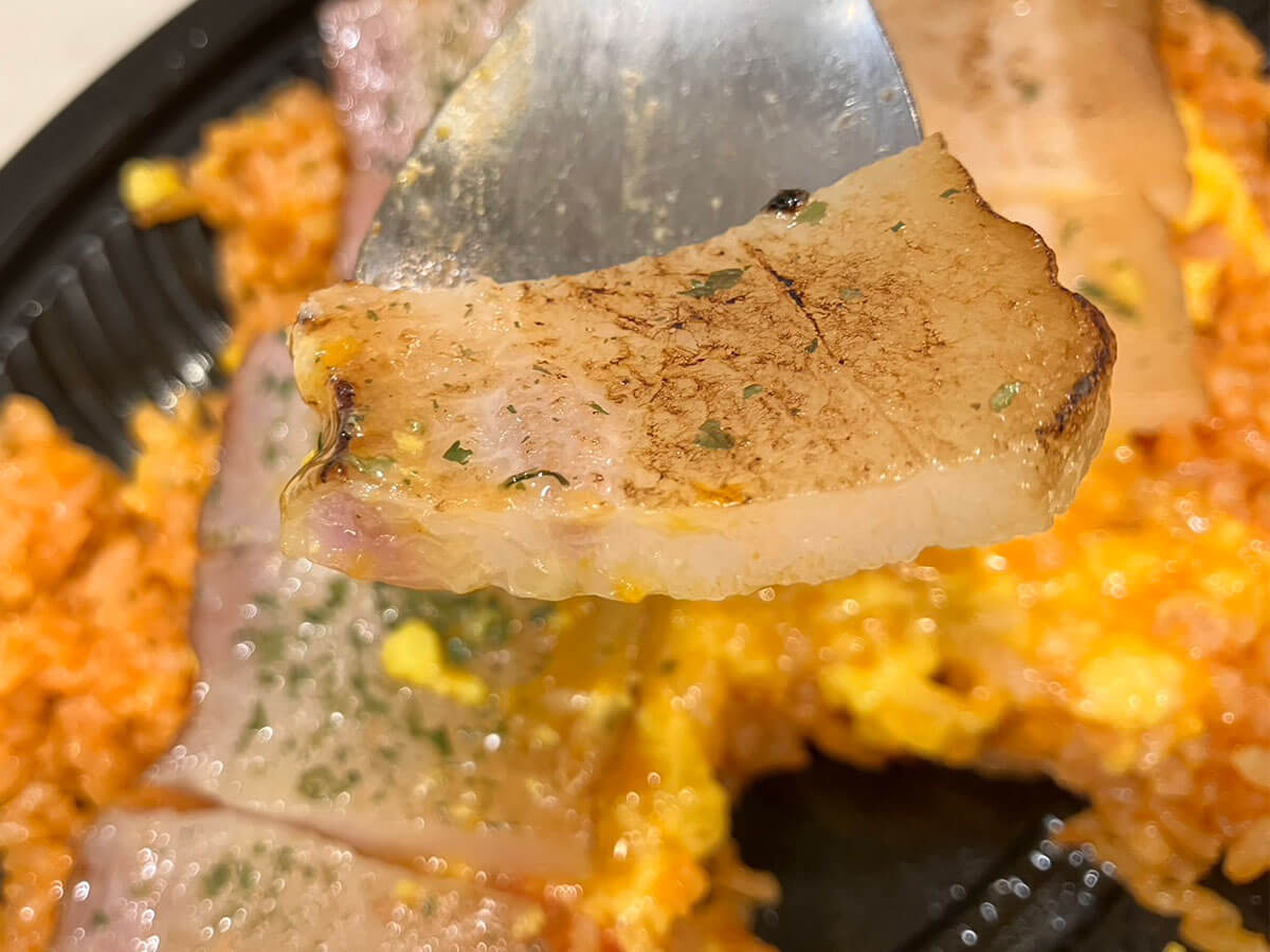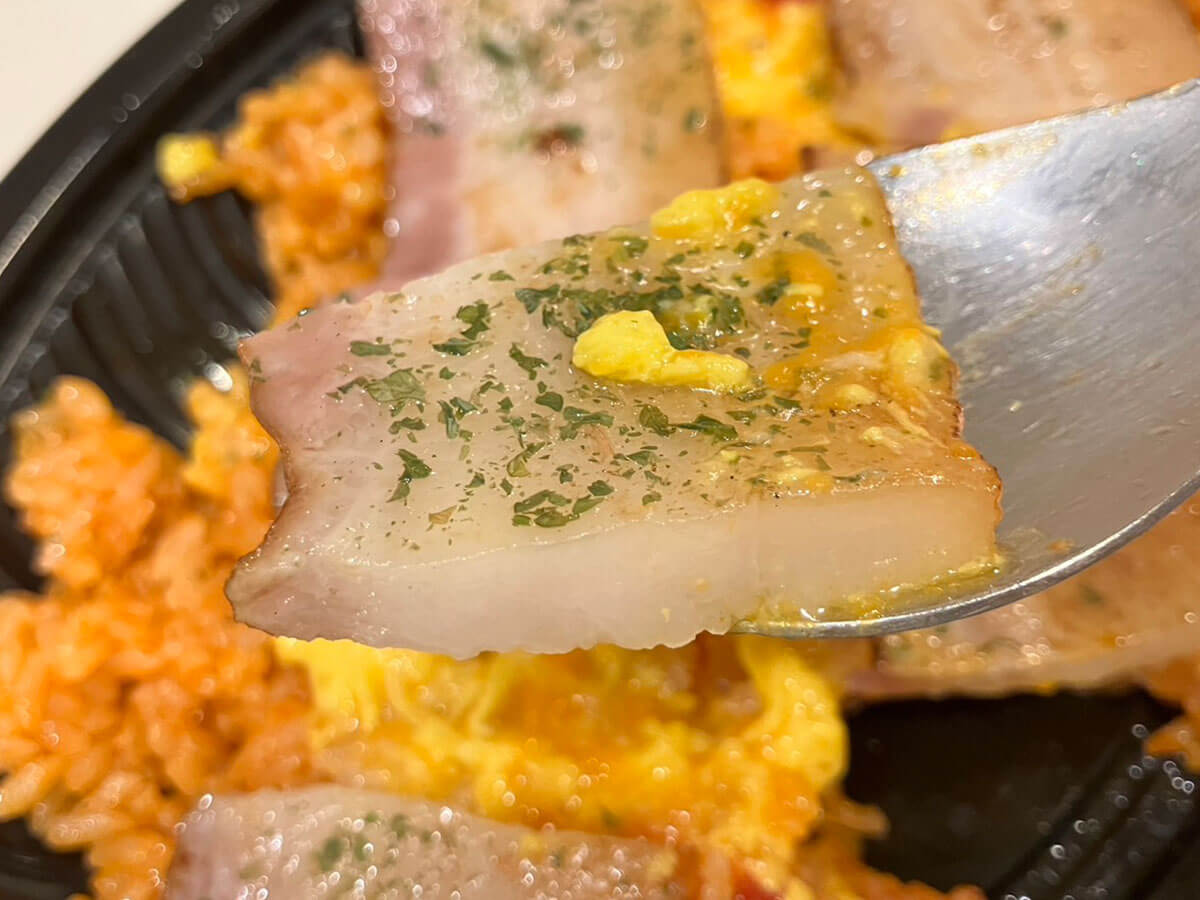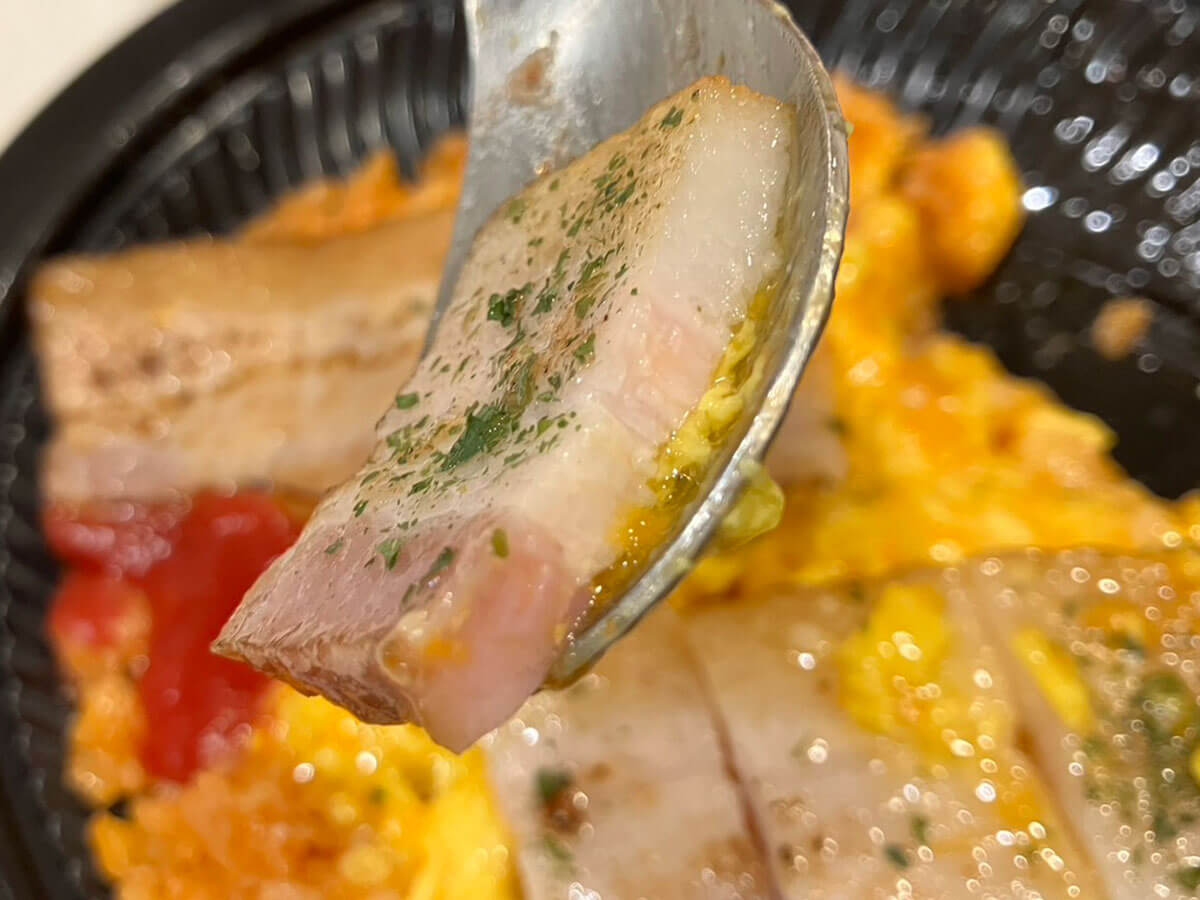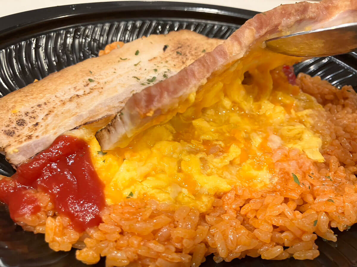 サイゾーウーマン暮らし食べ物【ロピア】486円オムライスを実食 暮らし ロピア集中連載 【ロピア】486円「自慢のベーコンど~ん!!オムライス」食べたら、「脂身9割」ベーコンで罪深かった! 2024/11/05 18:00 沢口ピア子(ライター) ロピア ロピアの看板(写真:サイゾーウーマン) 見た目が華やかで大容量と評判の「食生活♡♡ロピア」(読み:しょくせいかつラブラブロピア)のお惣菜。その中から豪快な見た目のオムライスを紹介します! 目次 ・【ロピア】10年で売上約7倍! 新店舗続々 ・「自慢のベーコンど~ん!!オムライス」をチェック ・自家製ベーコンをカット! ・自家製ベーコンが「ほぼ脂身」 ※価格はすべて税込み。 ※店舗によって取り扱い商品や価格が異なります。 ※2024年10月15日の情報です。 【ロピア】10年間で売上高は約7倍! 台湾にも5号店 ロピアの入り口(写真:サイゾーウーマン) OICグループ傘下で、首都圏を中心に全国約100店舗を展開するロピアは、この10年間で売上高は約7倍に増加し、新店舗も続々と開業。今年10月だけでも岐阜県、埼玉県、福岡県に加え、台湾5号店がオープンしました。 さらに、11月には札幌市・イトーヨーカドー屯田店の跡地に「北海道1号店」となるロピアが開業予定。道内では今後5年間で25店舗を出店予定だといい、一部メディアから「もっとも上場に近いスーパー」とも評されています。 【ロピア】「自慢のベーコンど~ん!!オムライス」486円をチェック そんなロピアで筆者がいつものようにお買い物していると、Xの“あの騒動”を彷彿とさせるオムライスを発見! こちらがその「自慢のベーコンど~ん!!オムライス」(486円)です。 筆者は30%引きで購入(写真:サイゾーウーマン) ベーコンは炙ってある様子(写真:サイゾーウーマン) オムライスにのっているのは、ロピアの自家製ベーコンだそうです。 店舗によっては6月頃から売られていたもよう。ただ、ネット上ではベーコンが1枚のっている商品ばかりが出てきますが、こちらは2枚のせ! ケチャップはハート型(写真:サイゾーウーマン) ベーコンをめくるとトロトロ玉子(写真:サイゾーウーマン) 原材料(写真:サイゾーウーマン) 主な材料は、ごはん、ナポリタンソース、半熟風玉子、ベーコン、トマトケチャップ、パセリ。どうやらケチャップライスに玉ねぎなどの具材は入っていないようです。 【ロピア】「自慢のベーコンど~ん!!オムライス」自家製ベーコンをカット! ギコギコ(写真:サイゾーウーマン) 早速食べようとしましたが、ぶ厚いベーコンがスプーンでは切れませんでした。 重い……(写真:サイゾーウーマン) 「自慢のベーコン」をそのまま持ち上げてみましたが、食べにくいかも……。 これでよし(写真:サイゾーウーマン) フォークに持ち替えて豪快にベーコンをいただくのも楽しそうですが、オムライスと一緒に食べたいのでキッチンバサミでカットしました。 【ロピア】自家製ベーコンが「ほぼ脂身」……背徳感がやばい 実はカットする前から薄々気づいていたのですが、カットしたことで確信に変わったことがあるんです……それは、ベーコンが2枚とも「ほぼ脂身」であること! ほぼ半透明の断面(写真:サイゾーウーマン) こっちも(写真:サイゾーウーマン) ピンク色の肉が付いた部分を発見(写真:サイゾーウーマン) 皆さんは、8月に「しゃぶしゃぶ温野菜」で食事をしたXユーザーが、「温野菜でこれが出てきて一瞬時が止まった」という文章とともに、9割以上が脂身と思われるしゃぶしゃぶ用イベリコ豚の画像をアップロードし、大騒動となったのを覚えていますでしょうか。なんとも、あの騒ぎを彷彿とさせるベーコンです。 筆者はおいしければ大概のことは問題ないタイプなので、今のところ「全然アリ」! ただ、すべての「自慢のベーコンど~ん!!オムライス」が脂身だらけなのではなく、こういうことはおそらく稀なので、「脂身より肉が食べたい」という方もご安心を。 背徳感がやばい(写真:サイゾーウーマン) ベーコンの脂身をのせたオムライスをいただいてみます。 シンプルなケチャップライスは甘めの味付けで、お子さまランチにありそうな懐かしい味わい。そこに豚の脂身の甘味が加わり、背徳感を覚えずにはいられない罪深い味でした。 ほぼ半透明のベーコンに目が釘付けとなった今回の実食。ロピアはこのほかにも豪快な商品や“映える”お惣菜が目白押しなので、お立ち寄りの際はぜひチェックしてみてくださいね。 非公開: 【ロピア新商品】486円「ミニバターワッフル」が濃厚でおいしい! 1個35円、一気食いに要注意 「今もっとも勢いのあるスーパーマーケット」と言っても過言ではない「食生活♡♡ロピア」(読み:しょくせいかつラブラブロピア)。こちらの惣菜コーナーで魅力的な新商品を発見...サイゾーウーマン2024.10.26非公開: 鎧塚パティシエの洋菓子店買収で騒然、【ロピア】スイーツの味は? 5品食べてみた! 食品スーパー「食生活♡♡ロピア」(読み:しょくせいかつラブラブロピア)を運営するOICグループ。10