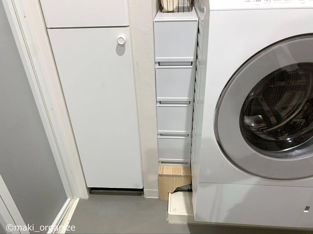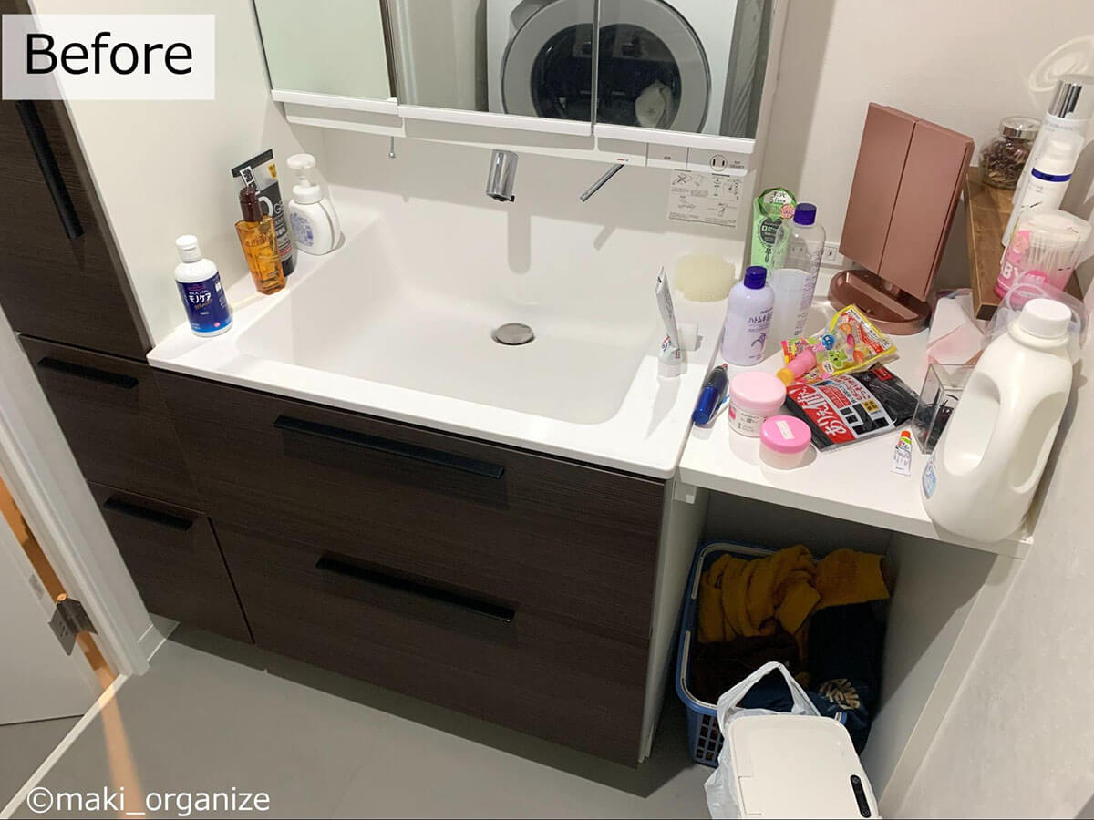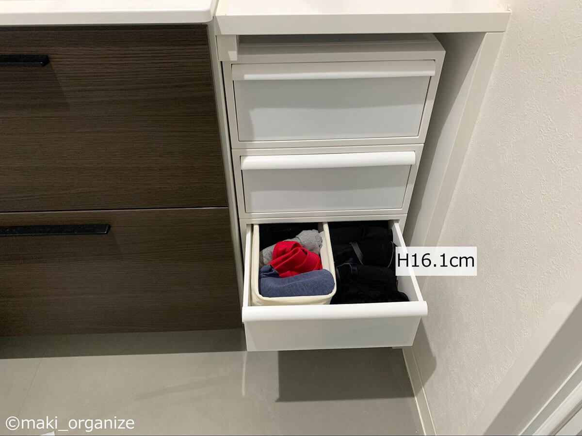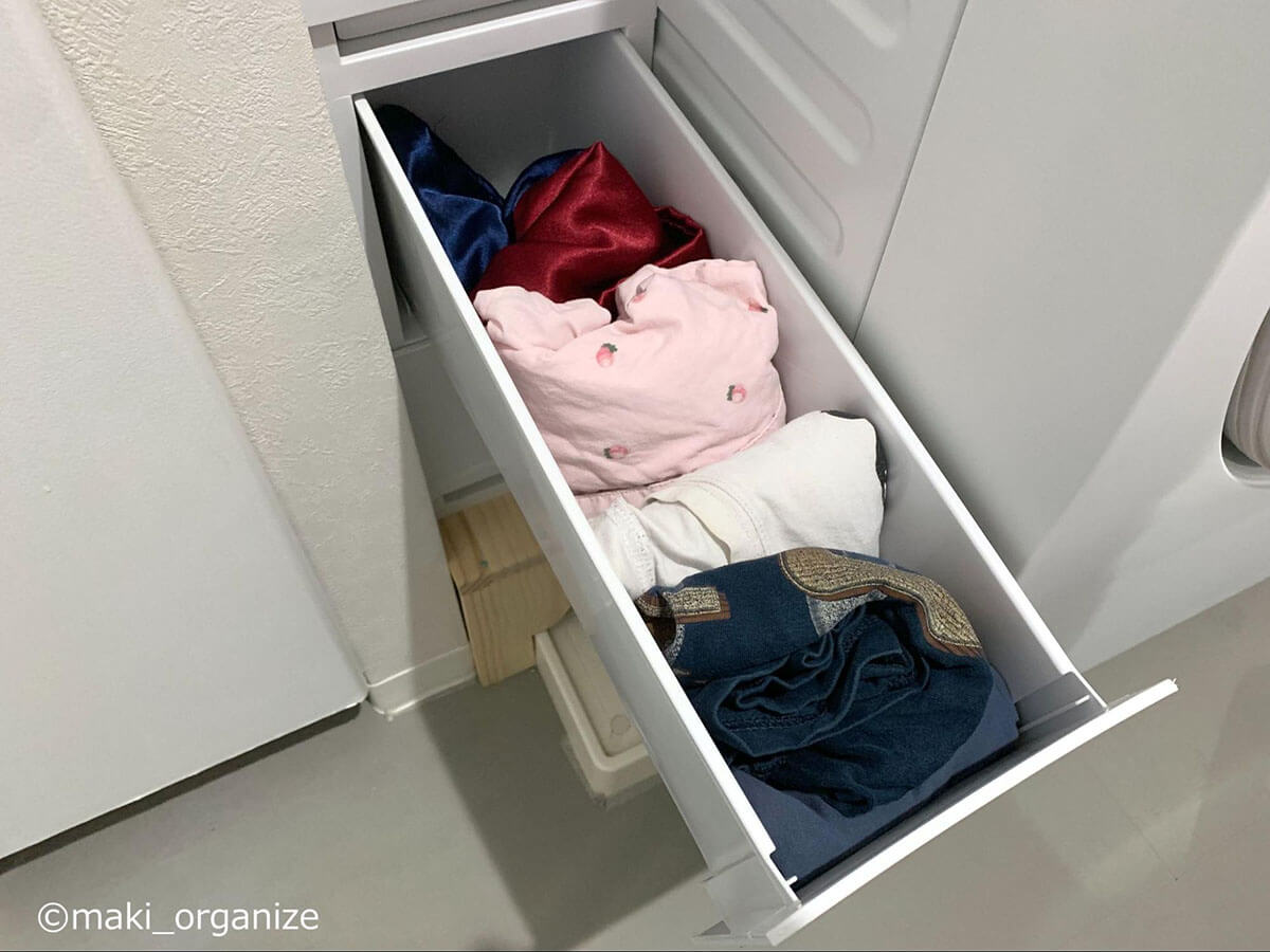 サイゾーウーマン暮らし住まい【洗面所】肌着&靴下「隙間収納」 暮らし [連載]女たちの「煩悩部屋」ビフォーアフター 【洗面所】隙間収納の実例アイデア! プロが選ぶ衣装ケースとポイントは? 2024/11/13 17:00 伊藤まき(収納ライター) 「汚部屋」ビフォーアフター 整理収納アドバイザーの伊藤まきさんが、片付けに悩む読者の自宅を使いやすく生まれ変わらせる連載シリーズ【「煩悩部屋」ビフォーアフター】。 連載企画『ビフォーアフター』新シーズンです。第10回目の片付けモニターは、東京都世田谷区・1SLDKで暮らす3人家族のまいさん(32歳)。今回は、汚部屋の片付けではなく「リノベマンション」の収納を手直しする特別編です。 目次 ・【お悩み】「肌着と靴下」を洗面所に移動させたい ・【洗面台まわり】「肌着収納」のポイント&ビフォーアフター ・洗面台まわりの隙間収納におすすめアイテム ・肌着の仕切り収納におすすめアイテム ・【洗濯機サイド】「靴下収納」のポイント&ビフォーアフター ・洗濯機サイドの隙間収納におすすめアイテム ・【まとめ】洗面所の隙間を活用して! 【お悩み】「肌着と靴下」を洗面所に移動させたい 寝室に収納していました(C)maki_organize クライアントプロフィール ・まいさん(32歳) ・保育園の園長先生(フルワーク) ・育児系インフルエンサー“まい先生“としても活躍 ・3人家族 ・1SLDK ・中古マンションをリノベーション購入(持ち家) ・東京都世田谷区在住 収納に関する要望 ・掃除や片付けの頻度を少なくしたい ・子どもが自分で身支度できる仕組みを作りたい ・ベッドルームのレイアウトを変えたい ・シンプルに暮らしたいので、家具を増やしたくない 今回のテーマは「肌着と靴下」の収納。まいさん宅では寝室に置いていましたが、洗濯機のある洗面所に移動すると、入浴後に便利なだけでなく、家事の負担も減らすことができます。 次からは、洗面所の隙間収納に最適な「衣装ケース」の選び方とビフォーアフターをご紹介していきます。 【Before】洗面台まわりに「肌着」を収納したい 引き出しの中は美容品でいっぱい(C)maki_organize 洗面台まわりのビフォー状態です。右下にランドリーバスケットとゴミ箱が置いてありますね。今回はこの空間を利用して「肌着収納」を行っていきます。 凸凹に注意して、空間のサイズを測ります(C)maki_organize ランドリーバスケットとゴミ箱を移動させ、空間のサイズを測ります。「中身が見えないようにしたい」という要望があったので、「色付き」の衣装ケースを選ぶことにしました。 今回は以下のメーカーのサイトで、サイズに合うケースを探していきます。 (1)ライクイット (2)リブウェル (3)ニトリ (4)山善 (5)JEJアステージ (6)天馬 (7)カインズ 【洗面台まわりの隙間収納におすすめ】 ライクイット「収納ボックス クローゼットシステム S」 キャスターつきなので掃除や衣替えもやりやすい(C)maki_organize サイズを確認していった結果、ライクイットの「収納ボックス クローゼットシステム S(W32×D52×H16.1cm)」がぴったりでした。凹凸が少なくスッキリしたデザインで、単品を積み重ねて使うことが可能。今回は4つ使用しています。 【ポイント】肌着収納は「高さ16cm」の引き出しが◎ 家族3人分の肌着が入りました(C)maki_organize 肌着収納は「浅めの引き出し」が使いやすいので、高さ16.1cmのタイプを選びました。女性用の下着も埋もれずに収納できるサイズです。連結型の衣装ケースだと、引き出しが深いタイプが多いので注意してください。 【肌着の仕切り収納におすすめ】 ダイソー「収納BOX(浅型 ハーフ)」110円 JANコード:4550480082165(C)maki_organize 引き出しの整理には、ダイソー「収納BOX(浅型 ハーフ)」110円を使いました。肌着や靴下の仕切りボックスにおすすめですが、売り切れが多い商品。手に入らない場合は、お菓子の空き箱や牛乳パック、紙袋などを使ってもOKです。 次からは、「靴下収納」についてご紹介していきます。 【Before】洗濯機サイドに「靴下」を収納したい きめ細かい相談ができるのが、リノベマンション!(C)maki_organize 「靴下収納」には、洗濯機と壁の隙間スペースを利用することにしました。 今回は特別にマンションのリノベーションを担当してくれた工務店さんが、洗濯機サイドの土台を作ってくれます。収納は「住んでからわかる」ので、アフターフォロー付きの工務店さんがいると心強いですね。 【ポイント1】洗濯機サイドの収納は排水口をカバー 洗濯機の取り扱い説明書によると、1cmの放熱スペースがあればOK(C)maki_organize 洗濯機サイドのカバー&土台の完成品です。空間のサイズに合わせた造作家具なので、さすがの安定感。市販品を使いたい場合は「洗濯機排水口上ラック」と検索すればOK。2,500円前後で、防水パンカバーにもなる土台が見つかります。 【洗濯機サイドの収納におすすめ】 リブウェル「プラストベーシック FR1704 4段」 サイズ:約幅17×奥行45×高さ75.5cm(C)maki_organize リブウェル「プラストベー