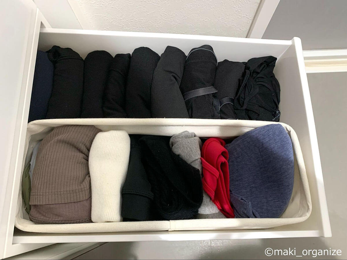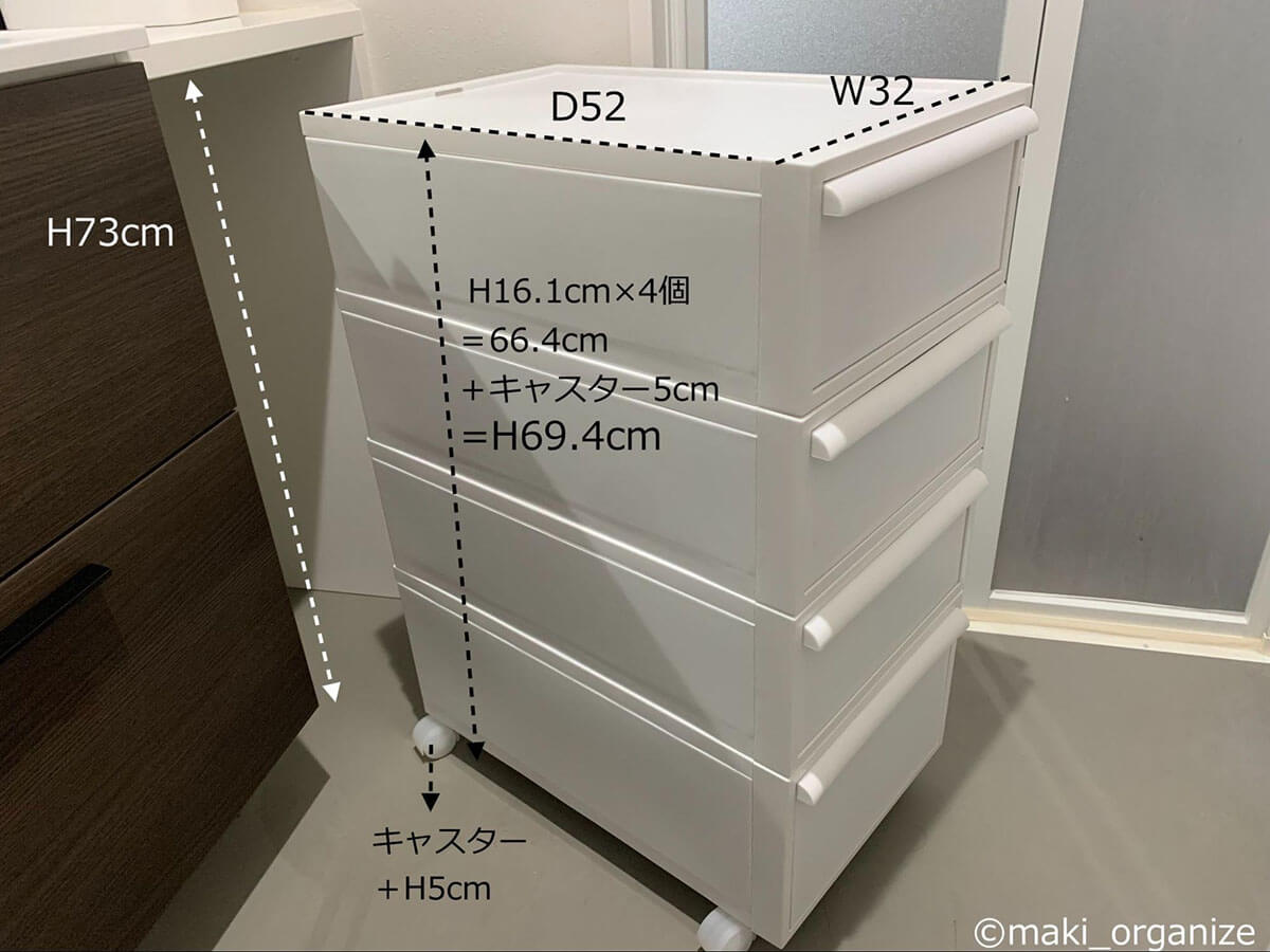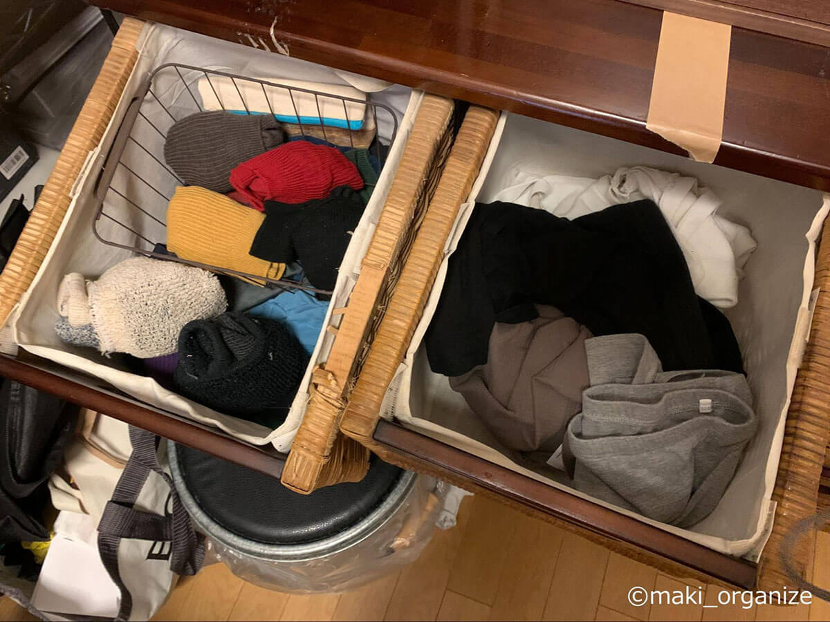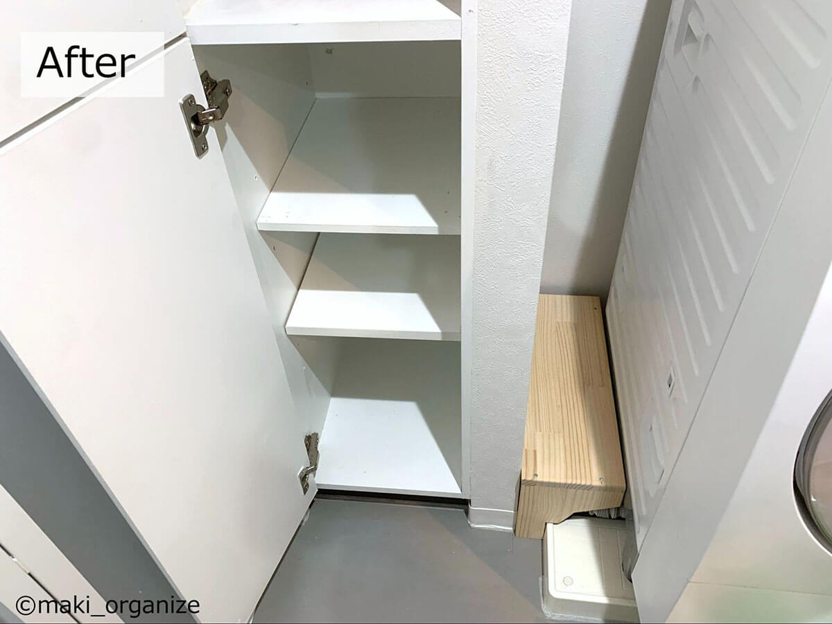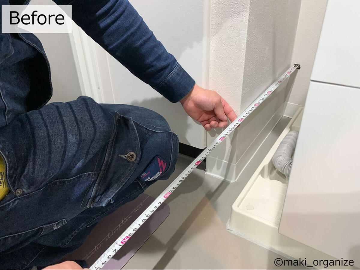サイゾーウーマン暮らし住まい【洗面所】肌着&靴下「隙間収納」 暮らし [連載]女たちの「煩悩部屋」ビフォーアフター 【洗面所】隙間収納の実例アイデア! プロが選ぶ衣装ケースとポイントは? 2024/11/13 17:00 伊藤まき(収納ライター) 「汚部屋」ビフォーアフター 整理収納アドバイザーの伊藤まきさんが、片付けに悩む読者の自宅を使いやすく生まれ変わらせる連載シリーズ【「煩悩部屋」ビフォーアフター】。 連載企画『ビフォーアフター』新シーズンです。第10回目の片付けモニターは、東京都世田谷区・1SLDKで暮らす3人家族のまいさん(32歳)。今回は、汚部屋の片付けではなく「リノベマンション」の収納を手直しする特別編です。 目次 ・【お悩み】「肌着と靴下」を洗面所に移動させたい ・【洗面台まわり】「肌着収納」のポイント&ビフォーアフター ・洗面台まわりの隙間収納におすすめアイテム ・肌着の仕切り収納におすすめアイテム ・【洗濯機サイド】「靴下収納」のポイント&ビフォーアフター ・洗濯機サイドの隙間収納におすすめアイテム ・【まとめ】洗面所の隙間を活用して! 【お悩み】「肌着と靴下」を洗面所に移動させたい 寝室に収納していました(C)maki_organize クライアントプロフィール ・まいさん(32歳) ・保育園の園長先生(フルワーク) ・育児系インフルエンサー“まい先生“としても活躍 ・3人家族 ・1SLDK ・中古マンションをリノベーション購入(持ち家) ・東京都世田谷区在住 収納に関する要望 ・掃除や片付けの頻度を少なくしたい ・子どもが自分で身支度できる仕組みを作りたい ・ベッドルームのレイアウトを変えたい ・シンプルに暮らしたいので、家具を増やしたくない 今回のテーマは「肌着と靴下」の収納。まいさん宅では寝室に置いていましたが、洗濯機のある洗面所に移動すると、入浴後に便利なだけでなく、家事の負担も減らすことができます。 次からは、洗面所の隙間収納に最適な「衣装ケース」の選び方とビフォーアフターをご紹介していきます。 【Before】洗面台まわりに「肌着」を収納したい 引き出しの中は美容品でいっぱい(C)maki_organize 洗面台まわりのビフォー状態です。右下にランドリーバスケットとゴミ箱が置いてありますね。今回はこの空間を利用して「肌着収納」を行っていきます。 凸凹に注意して、空間のサイズを測ります(C)maki_organize ランドリーバスケットとゴミ箱を移動させ、空間のサイズを測ります。「中身が見えないようにしたい」という要望があったので、「色付き」の衣装ケースを選ぶことにしました。 今回は以下のメーカーのサイトで、サイズに合うケースを探していきます。 (1)ライクイット (2)リブウェル (3)ニトリ (4)山善 (5)JEJアステージ (6)天馬 (7)カインズ 【洗面台まわりの隙間収納におすすめ】 ライクイット「収納ボックス クローゼットシステム S」 キャスターつきなので掃除や衣替えもやりやすい(C)maki_organize サイズを確認していった結果、ライクイットの「収納ボックス クローゼットシステム S(W32×D52×H16.1cm)」がぴったりでした。凹凸が少なくスッキリしたデザインで、単品を積み重ねて使うことが可能。今回は4つ使用しています。 【ポイント】肌着収納は「高さ16cm」の引き出しが◎ 家族3人分の肌着が入りました(C)maki_organize 肌着収納は「浅めの引き出し」が使いやすいので、高さ16.1cmのタイプを選びました。女性用の下着も埋もれずに収納できるサイズです。連結型の衣装ケースだと、引き出しが深いタイプが多いので注意してください。 【肌着の仕切り収納におすすめ】 ダイソー「収納BOX(浅型 ハーフ)」110円 JANコード:4550480082165(C)maki_organize 引き出しの整理には、ダイソー「収納BOX(浅型 ハーフ)」110円を使いました。肌着や靴下の仕切りボックスにおすすめですが、売り切れが多い商品。手に入らない場合は、お菓子の空き箱や牛乳パック、紙袋などを使ってもOKです。 次からは、「靴下収納」についてご紹介していきます。 【Before】洗濯機サイドに「靴下」を収納したい きめ細かい相談ができるのが、リノベマンション!(C)maki_organize 「靴下収納」には、洗濯機と壁の隙間スペースを利用することにしました。 今回は特別にマンションのリノベーションを担当してくれた工務店さんが、洗濯機サイドの土台を作ってくれます。収納は「住んでからわかる」ので、アフターフォロー付きの工務店さんがいると心強いですね。 【ポイント1】洗濯機サイドの収納は排水口をカバー 洗濯機の取り扱い説明書によると、1cmの放熱スペースがあればOK(C)maki_organize 洗濯機サイドのカバー&土台の完成品です。空間のサイズに合わせた造作家具なので、さすがの安定感。市販品を使いたい場合は「洗濯機排水口上ラック」と検索すればOK。2,500円前後で、防水パンカバーにもなる土台が見つかります。 【洗濯機サイドの収納におすすめ】 リブウェル「プラストベーシック FR1704 4段」 サイズ:約幅17×奥行45×高さ75.5cm(C)maki_organize リブウェル「プラストベー