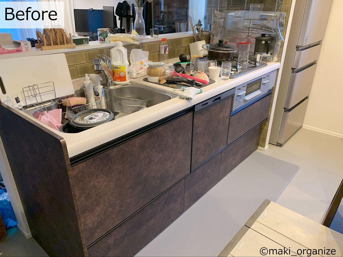 今回のテーマは「キッチン収納」です。引き出しが小さいので、食器が食洗機に「入れっぱなし」、調理器具が作業スペースに「出しっぱなし」といった状態になりやすいそう。