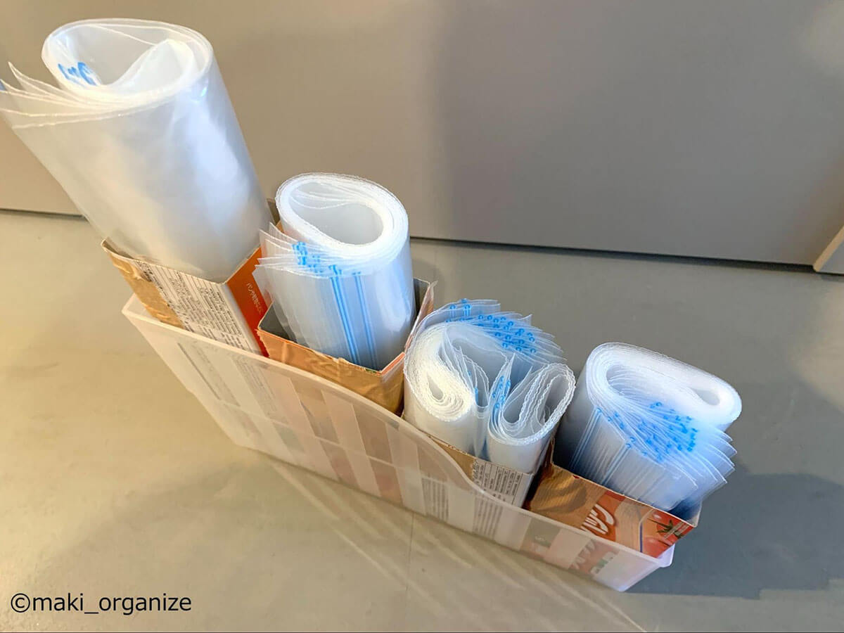 100均のポリ袋ケースに入れ替えていた、袋類のすべてを、ケースから外しました。引き出しが深めの場合は、保存袋の箱入りのままが正解。箱のサイドを少し切って、中身が見えるように「タテ入れ」すると、取り出しやすく散らかりません。