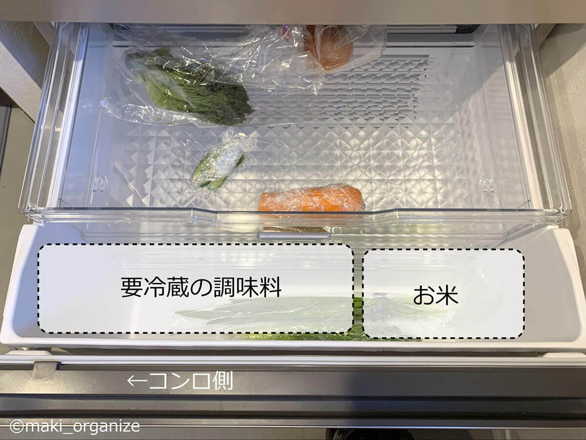 多くの調味料は「開栓後は冷蔵庫で保存」とボトルに記載されています。特に、醤油、ソース、めんつゆ、みりん(本みりん除く)など、酸化しやすいものは「要冷蔵」。野菜室の手前スペースに食材を入れることがほぼないということで、開栓後の調味料はこちらのスペースへ移動しました。