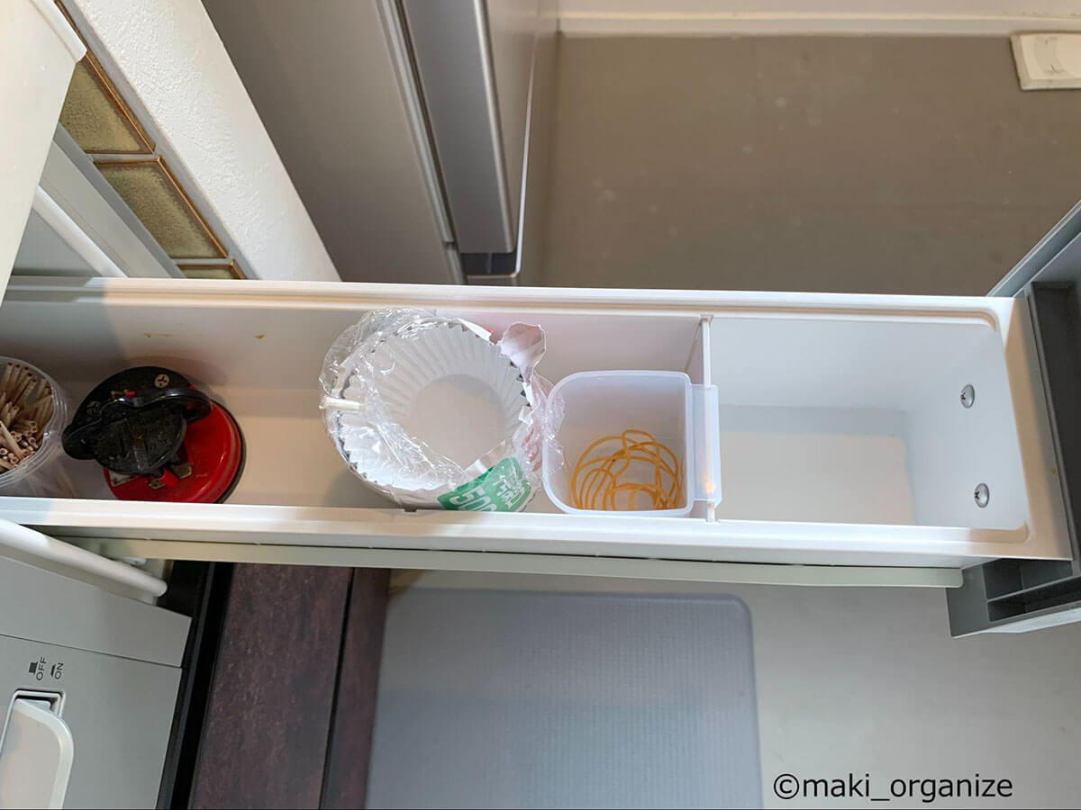 こちらはコンロ脇の小さな引き出し。ビフォー写真はありませんが、スパイス瓶が収納されていました。お子さまが開閉して取り出してしまうということなので、別の場所へ移動。取り出しても困らないモノだけを入れました。