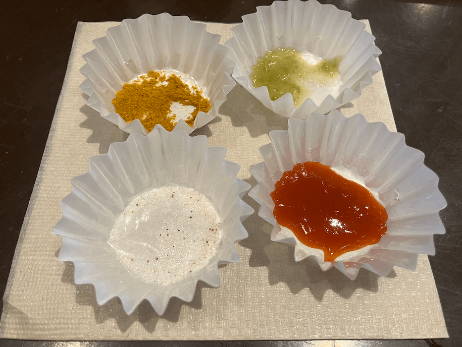 味わいも素朴で、塩の味は控えめ。フレッシュネスには各国の調味料が用意されているので、さっそく、お気に入りの味を見つけてみます。