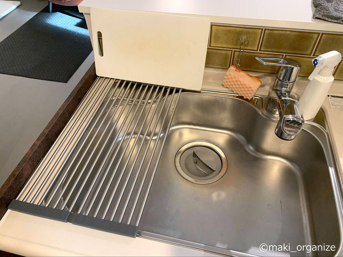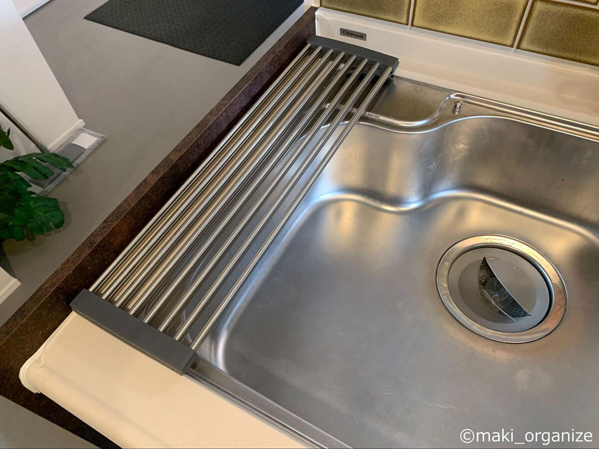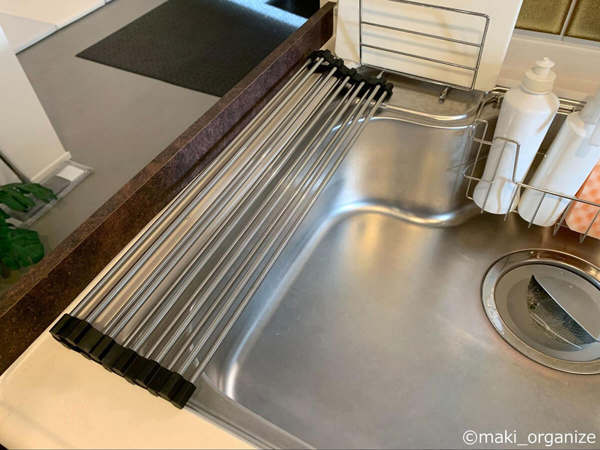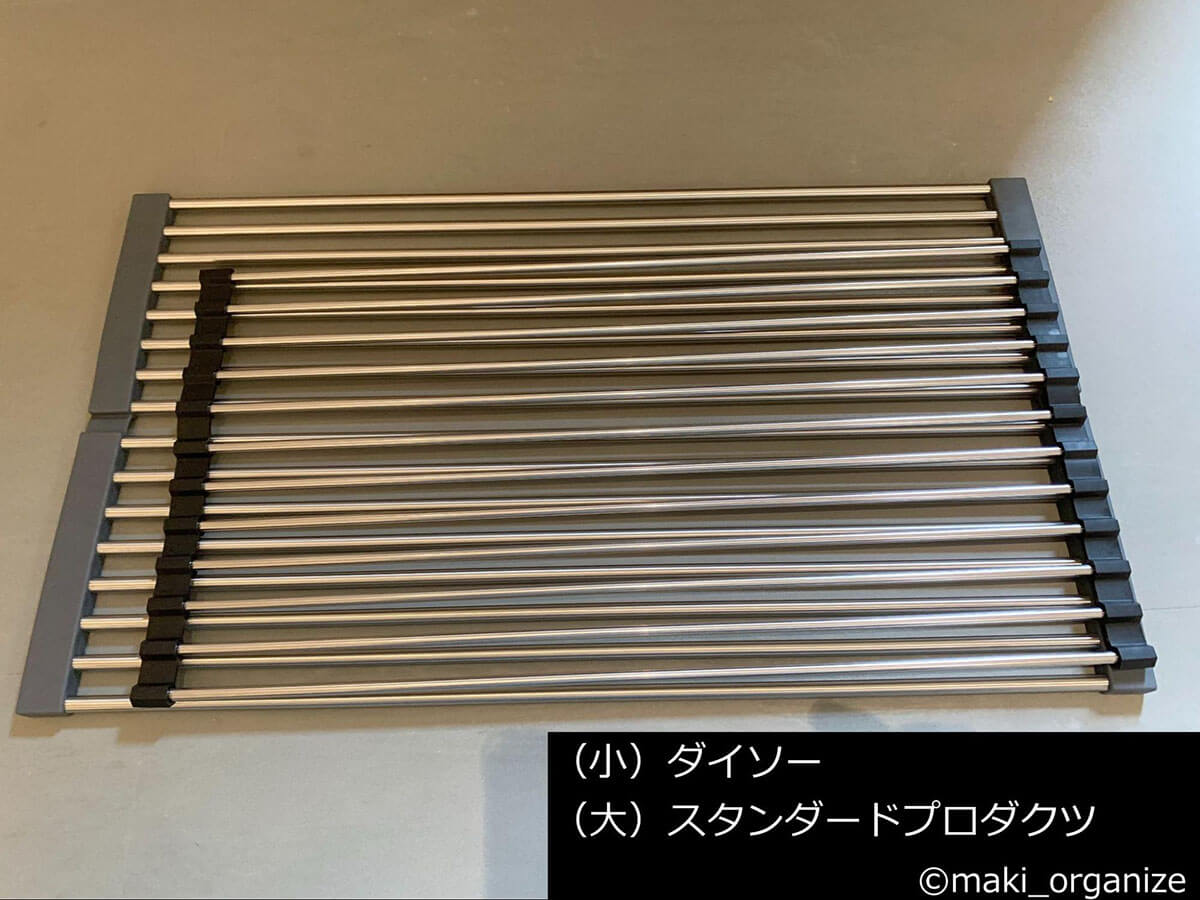 サイゾーウーマン暮らし住まい【キッチン】作業スペースを増やす方法 暮らし [連載]女たちの「煩悩部屋」ビフォーアフター キッチンの作業スペース増やすなら「550円のコレ」! プロが教える、ダイソーより優秀な一品は? 2025/01/08 17:00 伊藤まき(収納ライター) 「汚部屋」ビフォーアフター 整理収納アドバイザーの伊藤まきさんが、片付けに悩む読者の自宅を使いやすく生まれ変わらせる連載シリーズ【「煩悩部屋」ビフォーアフター】。 連載企画『ビフォーアフター』新シーズンです。第10回目の片付けモニターは、東京都世田谷区・1SLDKで暮らす3人家族のまいさん(32歳)。今回は、汚部屋の片付けではなく「リノベマンション」の収納を手直しする特別編です。 目次 ・【お悩み】キッチンの作業スペースが狭くて使いにくい ・【ポイント】作業スペースが広いほど家事が楽に! ・【解決案】折りたたみ式の水切りを「作業台の反対側」に置く ・【ダイソー】折りたためる水切り ・【スタンダードプロダクツ】ステンレス水切りラック ・【スタンダードプロダクツ】ステンレス水切り 伸縮型 ・【まとめ】作業スペースを増やすには「反対側」に水切りを設置! 【お悩み】キッチンの作業スペースが狭くて使いにくい 作業台の上に「水切り」があると置きっ放しになりがち(C)maki_organize クライアントプロフィール ・まいさん(32歳) ・保育園の園長先生(フルワーク) ・育児系インフルエンサー“まい先生“としても活躍 ・3人家族 ・1SLDK ・中古マンションをリノベーション購入(持ち家) ・東京都世田谷区在住 収納に関する要望 ・掃除や片付けの頻度を少なくしたい ・子どもが自分で身支度できる仕組みを作りたい ・ベッドルームのレイアウトを変えたい ・シンプルに暮らしたいので、家具を増やしたくない キッチンの作業スペースが「シンクの横だけ」なので、狭くて使いにくいというお悩みはありませんか? そこで今回はシンク内に水切りを設置して「作業スペースを増やす」方法をご紹介します。 作業スペースが広いほど家事が楽に! 水切りマットは水切れがやや遅い(C)maki_organize シンク横に写真のような「水切りマット(A)」を置きっ放しにすると「作業スペース(B)」が半分になります。水切りマットは省スペースで済むというメリットがある一方、洗った食器が乾くまで置きっ放しにしがちというデメリットも。 こまめに食器を拭いて、片付けながら調理をするのが面倒だと思う方は、マットではなく金属製の水切りを活用するのがおすすめです。 【解決案】折りたたみ式の水切りを「作業台の反対側」に置く キッチンのシンクを覆うサイズを選ぶと◎(C)maki_organize キッチンの作業スペースの反対側に「折りたたみ式の水切り」を配置します。とても有名でシンプルな方法ですが「サイズ選びで失敗しやすい」という点も。そこで次からは、ダイソー(小)とスタンダードプロダクツ(大)を比較して、サイズ感の違いを紹介していきます。 【ダイソー】折りたためる水切り 330円(税込) JANコード:4550480025735(C)maki_organize ダイソー「折りたためる水切り」330円(税込)です。THREEPPY(スリーピー)や3COINS(スリーコインズ)にも同じ価格で、同じようなサイズ(D47cm)の商品があります。 シンクより小さいと使いにくいので注意! 商品サイズ:W23.5×D47cm(シンクはD50cm)(C)maki_organize シンクのサイズより小さめなので、重めの調理鍋を載せるとズレたり落下する心配が出ます。シンクの凹部分を覆うサイズが良いので、ご自宅のシンクのサイズを測ってから選ぶようにしましょう。 くるくる丸めてたたむ「ロールタイプ」 水滴がそのままシンクに落ちるのも利点(C)maki_organize 使わない時は、くるくるっと左側へ巻いて片づけることができます。食器はもちろん、洗った野菜の水切りに使ってもOK。ただし、シリコン部分の凹凸が多いためカビが出やすいという欠点も……。使用する場合はこまめに乾燥させるようにしましょう。 【スタンダードプロダクツ】ステンレス水切りラック 550円(税込) JANコード:4550480245034(C)maki_organize スタンダードプロダクツ「ステンレス水切りラック」550円(税込)です。ダイソーに比べると、ひとまわり大きくステンレスの棒も太くて頑丈! 今回のテーマでは、これが「正解の商品」です◎ シンクより大きめなので使いやすい! 商品サイズ:W30.3×53.3cm(シンクはD50cm)(C)maki_organize シンクのサイズ(D50cm)を覆う大きさ(D53.3cm)なので、とても安定感があります。シリコン部分も凹凸が少なくてフラット。凸凹が多いタイプに比べると、カビも出にくいと思います。 二つ折りに「たたむタイプ」 食器が乾くまで、置きっ放しできるのが楽!(C)maki_organize 二つ折りにたたんでコンパクトにすることもできます。頑丈さ、デザイン、使用感すべて優れているので、まいさん宅ではこちらを使うことにしました。シンクの右側で調理しながら、調理道具や野菜などの「洗い物」を左側へ置くことができます。 【スタンダードプロダクツ】ステンレス水切