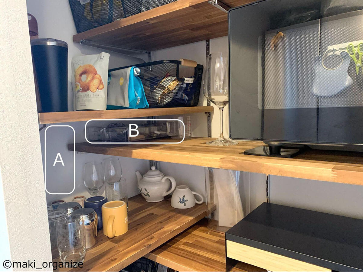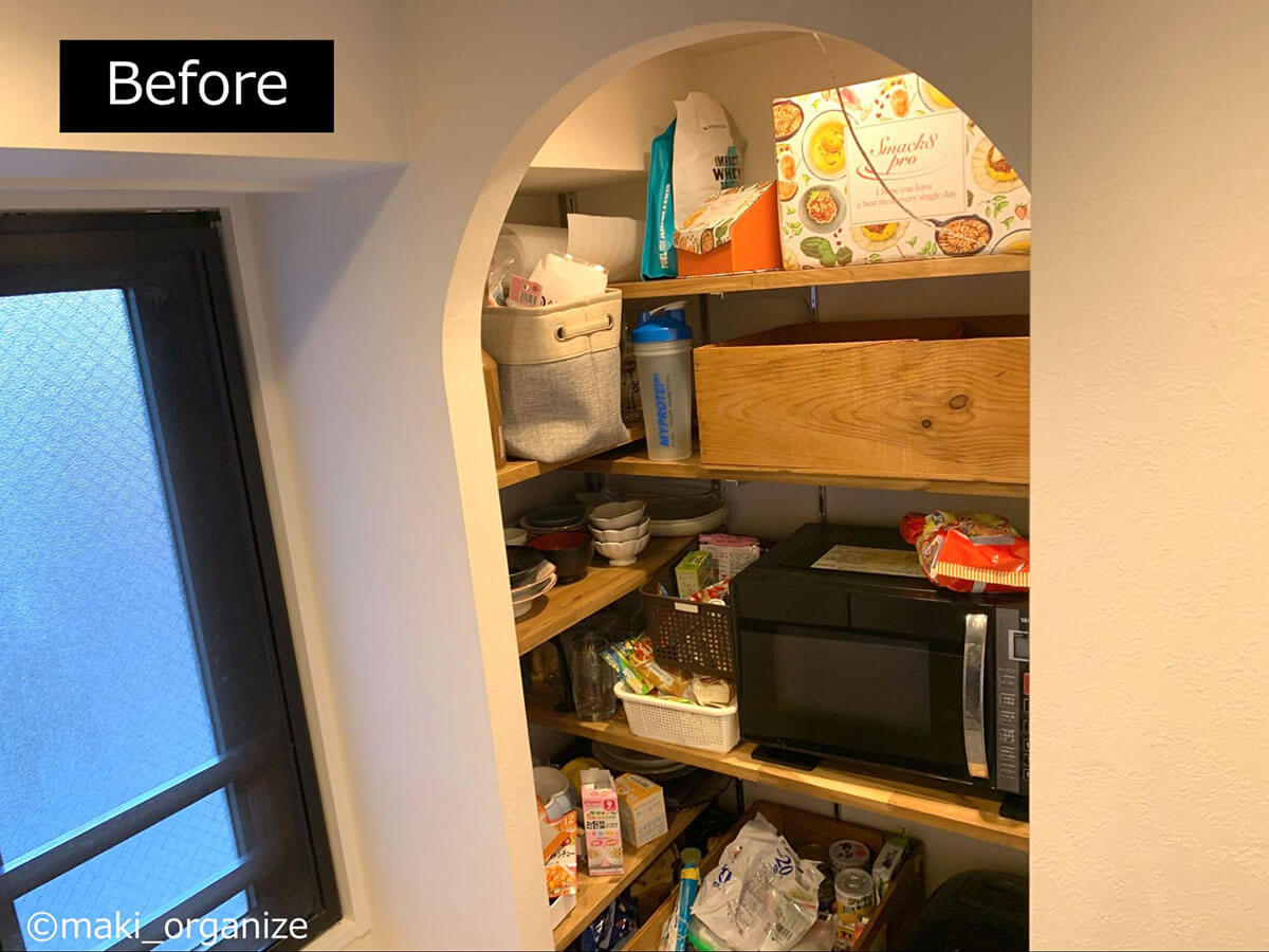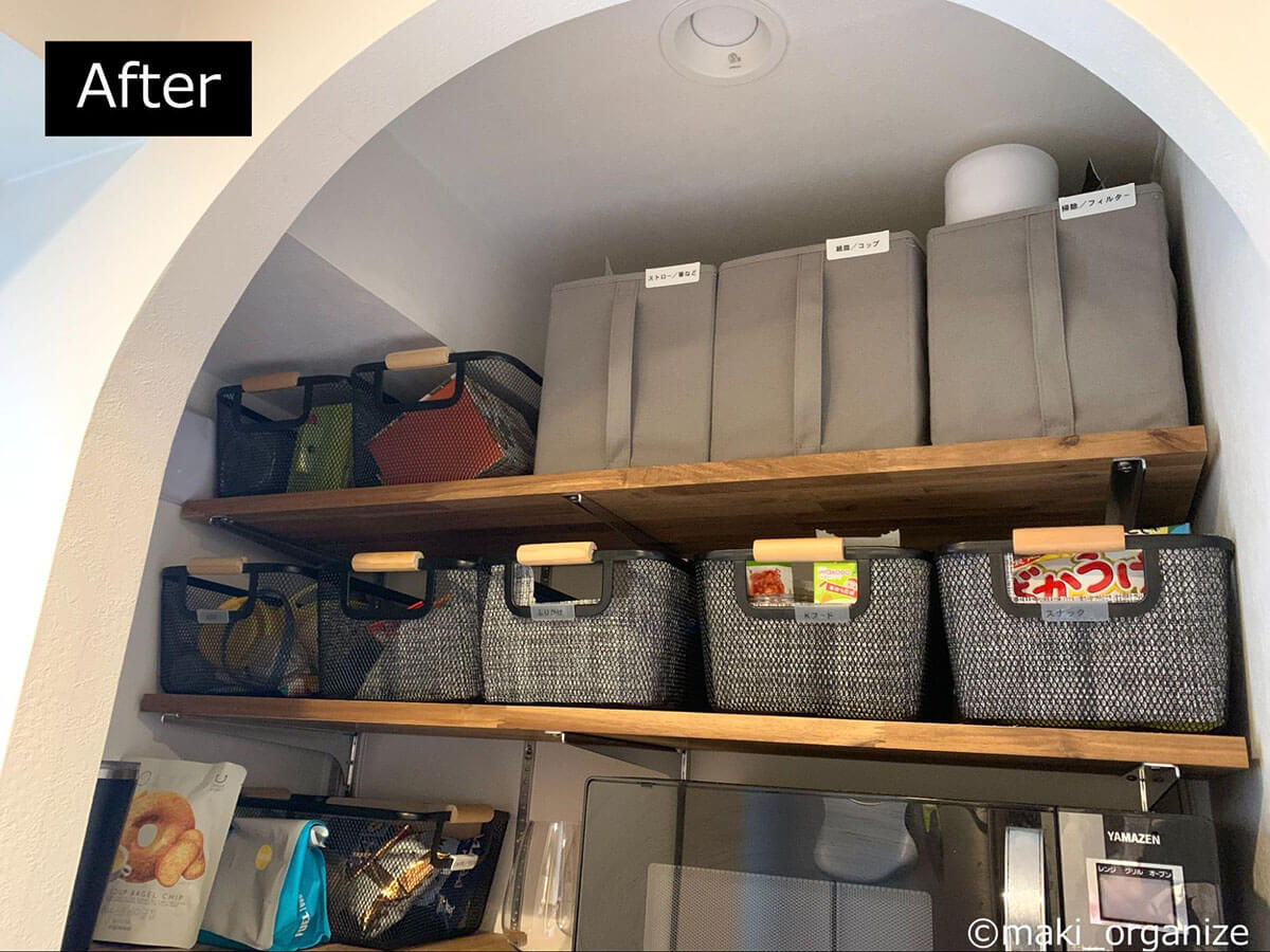 サイゾーウーマン暮らし住まい【ダイソー】550円「ワイヤーカゴ」でスッキリ 暮らし [連載]女たちの「煩悩部屋」ビフォーアフター 【ダイソー】550円「ワイヤーカゴ」でスッキリ! おしゃれに見えるキッチン収納術3 2025/01/22 17:00 伊藤まき(収納ライター) 「汚部屋」ビフォーアフター 整理収納アドバイザーの伊藤まきさんが、片付けに悩む読者の自宅を使いやすく生まれ変わらせる連載シリーズ【「煩悩部屋」ビフォーアフター】。 連載企画『ビフォーアフター』新シーズンです。第10回目の片付けモニターは、東京都世田谷区・1SLDKで暮らす3人家族のまいさん(32歳)。今回は、汚部屋の片付けではなく「リノベマンション」の収納を手直しする特別編です。 目次 ・【お悩み】キッチン「パントリー」の収納が難しい ・【上段ビフォー&アフター】Standard Products「布製収納ボックス」 ・デザイン性が高い「吊り戸棚ボックス」の探し方 ・【中段ビフォー&アフター】ダイソー「ワイヤーカゴ」 ・デザイン性が高い「収納ボックス」の選び方 ・【下段ビフォー&アフター】「冷蔵庫用小物トレー」 ・【まとめ】トーンを合わせれば、おしゃれでスッキリした印象に 【お悩み】キッチン「パントリー」の収納が難しい (C)maki_organize クライアントプロフィール ・まいさん(32歳) ・保育園の園長先生(フルワーク) ・育児系インフルエンサー“まい先生“としても活躍 ・3人家族 ・1SLDK ・中古マンションをリノベーション購入(持ち家) ・東京都世田谷区在住 収納に関する要望 ・掃除や片付けの頻度を少なくしたい ・子どもが自分で身支度できる仕組みを作りたい ・ベッドルームのレイアウトを変えたい ・シンプルに暮らしたいので、家具を増やしたくない 前回に続き、キッチン「パントリー」の収納を見直していきます。棚板が交差するL型の空間になっていますが、「収納が難しい」「生活感が漂う」とお悩みでした。そこで今回はおしゃれにスッキリ片付く「収納グッズの選び方」を詳しく紹介していきます。 【上段ビフォー】出し入れしにくい&中身が把握できない 使っていない家電の空き箱は処分しました(C)maki_organize 最上段に布製の収納ボックスと家電の空き箱が置かれていました。どちらも両手を使って出し入れする必要があり、外から中身がわかりません。 【上段アフター】片手で取り出せる「吊り戸棚ボックス」が正解 ボックスの中身をラベリングするとわかりやすい(C)maki_organize 手が届きにくい上段には、取っ手付きの収納ボックスを使うのが正解です。今回はキッチンのインテリアに合わせて黒系の配色でまとめることにしたので、Standard Productsの「布製収納ボックス グレー」330円(現在は販売していません)を選びました。 デザイン性が高い「吊り戸棚ボックス」の探し方 中身はフィルターや紙皿など「軽いモノ」がおすすめ(C)maki_organize 「吊り戸棚ボックス」は、取っ手が長いほど手が届きやすいです。「白のプラスチックボックス」が一般的ですが、ベージュやグレーの商品を選びたい場合は「吊り戸棚ボックス グレー」「取っ手付きボックス かご」などの語句で検索すると良いでしょう。 【中段ビフォー】プラスチック製かごを木箱に入れて目隠し チープさが目立ちがちなプラスチック製品(C)maki_organize 中段にはお菓子や食材を収納。写真のように100均のプラスチックかごにまとめていますが、生活感が漂うので木箱の中に入れて目隠ししていました。リビングから見えるゾーンなので、おしゃれなボックスを使いたいとのことです。 【中段アフター】ダイソー550円「ワイヤーカゴ」がぴったり! JANコード:4550480205908(C)maki_organize 棚の奥行きが35cmなので、サイズがぴったりなダイソー「ワイヤーカゴ 黒」550円で統一しました。白、グレー、黒の3色展開ですが、人気のため品切れが多い商品。プラスチック製に比べて、アイアン製のほうがおしゃれでスッキリ見えます。 デザイン性が高い「収納ボックス」の選び方 サイズ(W22×D33×H14cm)(C)maki_organize 選び方によってはチープに見えがちな「プラスチック製」の収納ボックスですが、汚れたら洗えるというメリットがあります。しかし、100均だと素材が薄くて割れやすいので、ニトリやイケアの頑丈な商品を選ぶと良いでしょう。今回のような「スチール製バスケット」を選ぶなら、無印良品やカインズがおすすめ。おしゃれでスッキリとしたデザインが揃っています。 なお、木製のボックスやラタン製のかごに食材を入れると、汚れが落としにくいのであまりおすすめできません。入れるモノと収納する素材の組み合わせも考慮するようにしましょう。 【下段ビフォー】ほこりが溜まりやすく、出し入れも面倒 「シンクから食器を戻しやすい」位置へ移動(C)maki_organize 食器棚がないので、下段にお皿やお椀などを収納していました。ほこりが溜まりやすいので「いちいち洗うのが大変」とまいさん。出し入れもしにくかったため、食器類はシステムキッチンの引き出しに移