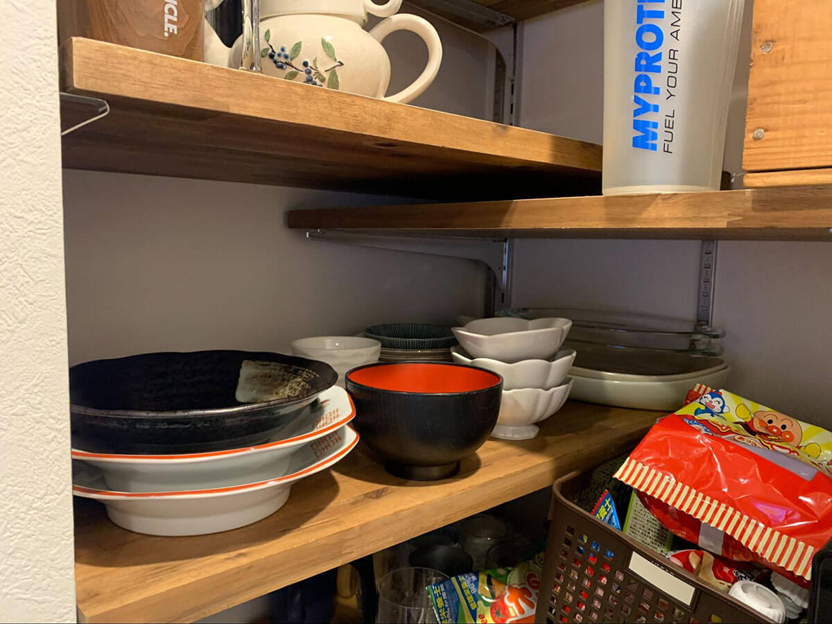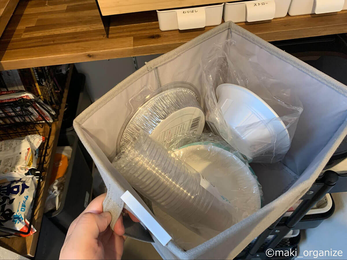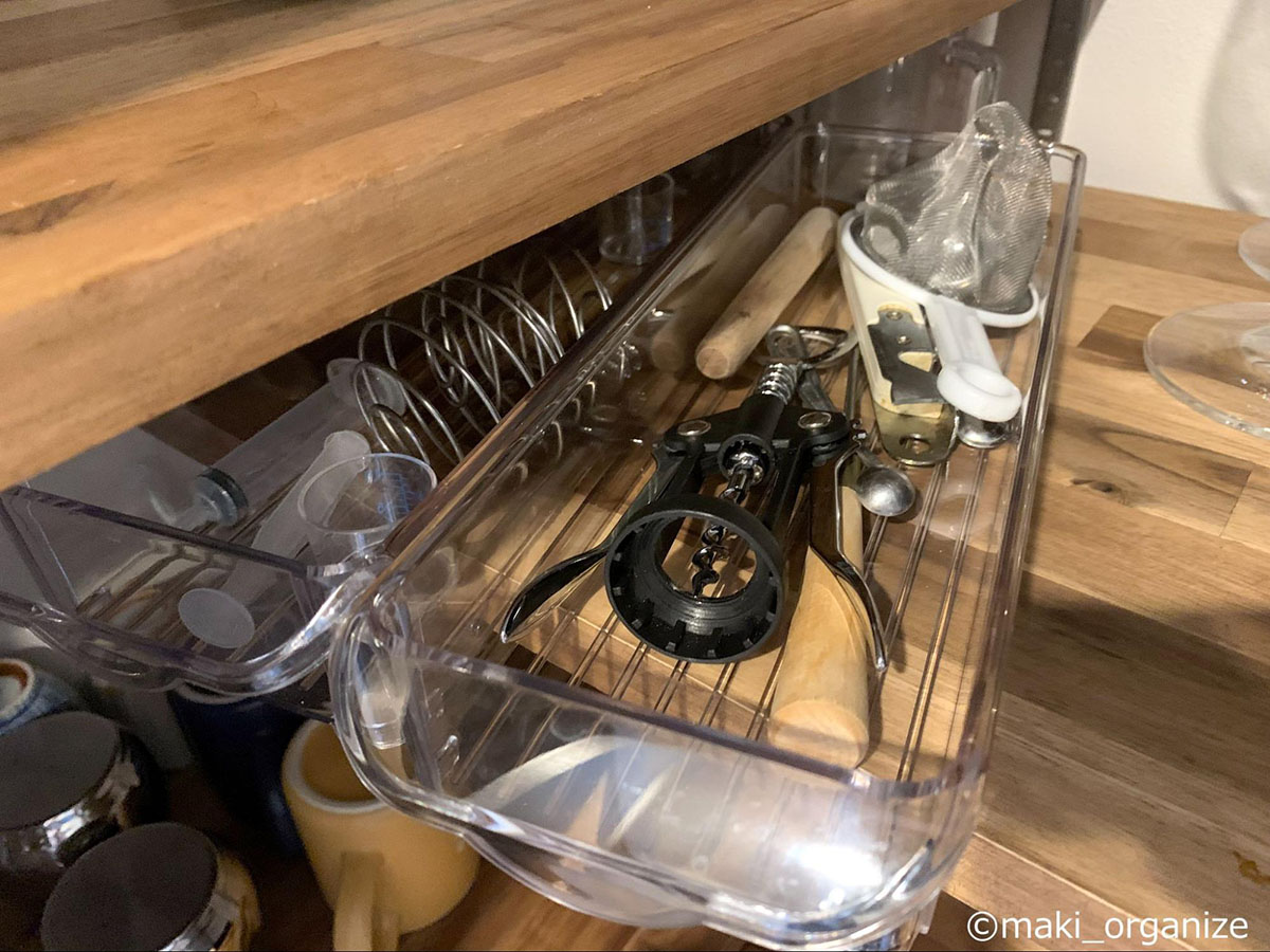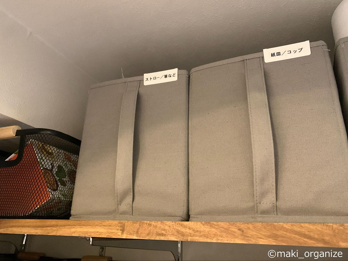 サイゾーウーマン暮らし住まい【ダイソー】550円「ワイヤーカゴ」でスッキリ 暮らし [連載]女たちの「煩悩部屋」ビフォーアフター 【ダイソー】550円「ワイヤーカゴ」でスッキリ! おしゃれに見えるキッチン収納術3 2025/01/22 17:00 伊藤まき(収納ライター) 「汚部屋」ビフォーアフター 整理収納アドバイザーの伊藤まきさんが、片付けに悩む読者の自宅を使いやすく生まれ変わらせる連載シリーズ【「煩悩部屋」ビフォーアフター】。 連載企画『ビフォーアフター』新シーズンです。第10回目の片付けモニターは、東京都世田谷区・1SLDKで暮らす3人家族のまいさん(32歳)。今回は、汚部屋の片付けではなく「リノベマンション」の収納を手直しする特別編です。 目次 ・【お悩み】キッチン「パントリー」の収納が難しい ・【上段ビフォー&アフター】Standard Products「布製収納ボックス」 ・デザイン性が高い「吊り戸棚ボックス」の探し方 ・【中段ビフォー&アフター】ダイソー「ワイヤーカゴ」 ・デザイン性が高い「収納ボックス」の選び方 ・【下段ビフォー&アフター】「冷蔵庫用小物トレー」 ・【まとめ】トーンを合わせれば、おしゃれでスッキリした印象に 【お悩み】キッチン「パントリー」の収納が難しい (C)maki_organize クライアントプロフィール ・まいさん(32歳) ・保育園の園長先生(フルワーク) ・育児系インフルエンサー“まい先生“としても活躍 ・3人家族 ・1SLDK ・中古マンションをリノベーション購入(持ち家) ・東京都世田谷区在住 収納に関する要望 ・掃除や片付けの頻度を少なくしたい ・子どもが自分で身支度できる仕組みを作りたい ・ベッドルームのレイアウトを変えたい ・シンプルに暮らしたいので、家具を増やしたくない 前回に続き、キッチン「パントリー」の収納を見直していきます。棚板が交差するL型の空間になっていますが、「収納が難しい」「生活感が漂う」とお悩みでした。そこで今回はおしゃれにスッキリ片付く「収納グッズの選び方」を詳しく紹介していきます。 【上段ビフォー】出し入れしにくい&中身が把握できない 使っていない家電の空き箱は処分しました(C)maki_organize 最上段に布製の収納ボックスと家電の空き箱が置かれていました。どちらも両手を使って出し入れする必要があり、外から中身がわかりません。 【上段アフター】片手で取り出せる「吊り戸棚ボックス」が正解 ボックスの中身をラベリングするとわかりやすい(C)maki_organize 手が届きにくい上段には、取っ手付きの収納ボックスを使うのが正解です。今回はキッチンのインテリアに合わせて黒系の配色でまとめることにしたので、Standard Productsの「布製収納ボックス グレー」330円(現在は販売していません)を選びました。 デザイン性が高い「吊り戸棚ボックス」の探し方 中身はフィルターや紙皿など「軽いモノ」がおすすめ(C)maki_organize 「吊り戸棚ボックス」は、取っ手が長いほど手が届きやすいです。「白のプラスチックボックス」が一般的ですが、ベージュやグレーの商品を選びたい場合は「吊り戸棚ボックス グレー」「取っ手付きボックス かご」などの語句で検索すると良いでしょう。 【中段ビフォー】プラスチック製かごを木箱に入れて目隠し チープさが目立ちがちなプラスチック製品(C)maki_organize 中段にはお菓子や食材を収納。写真のように100均のプラスチックかごにまとめていますが、生活感が漂うので木箱の中に入れて目隠ししていました。リビングから見えるゾーンなので、おしゃれなボックスを使いたいとのことです。 【中段アフター】ダイソー550円「ワイヤーカゴ」がぴったり! JANコード:4550480205908(C)maki_organize 棚の奥行きが35cmなので、サイズがぴったりなダイソー「ワイヤーカゴ 黒」550円で統一しました。白、グレー、黒の3色展開ですが、人気のため品切れが多い商品。プラスチック製に比べて、アイアン製のほうがおしゃれでスッキリ見えます。 デザイン性が高い「収納ボックス」の選び方 サイズ(W22×D33×H14cm)(C)maki_organize 選び方によってはチープに見えがちな「プラスチック製」の収納ボックスですが、汚れたら洗えるというメリットがあります。しかし、100均だと素材が薄くて割れやすいので、ニトリやイケアの頑丈な商品を選ぶと良いでしょう。今回のような「スチール製バスケット」を選ぶなら、無印良品やカインズがおすすめ。おしゃれでスッキリとしたデザインが揃っています。 なお、木製のボックスやラタン製のかごに食材を入れると、汚れが落としにくいのであまりおすすめできません。入れるモノと収納する素材の組み合わせも考慮するようにしましょう。 【下段ビフォー】ほこりが溜まりやすく、出し入れも面倒 「シンクから食器を戻しやすい」位置へ移動(C)maki_organize 食器棚がないので、下段にお皿やお椀などを収納していました。ほこりが溜まりやすいので「いちいち洗うのが大変」とまいさん。出し入れもしにくかったため、食器類はシステムキッチンの引き出しに移